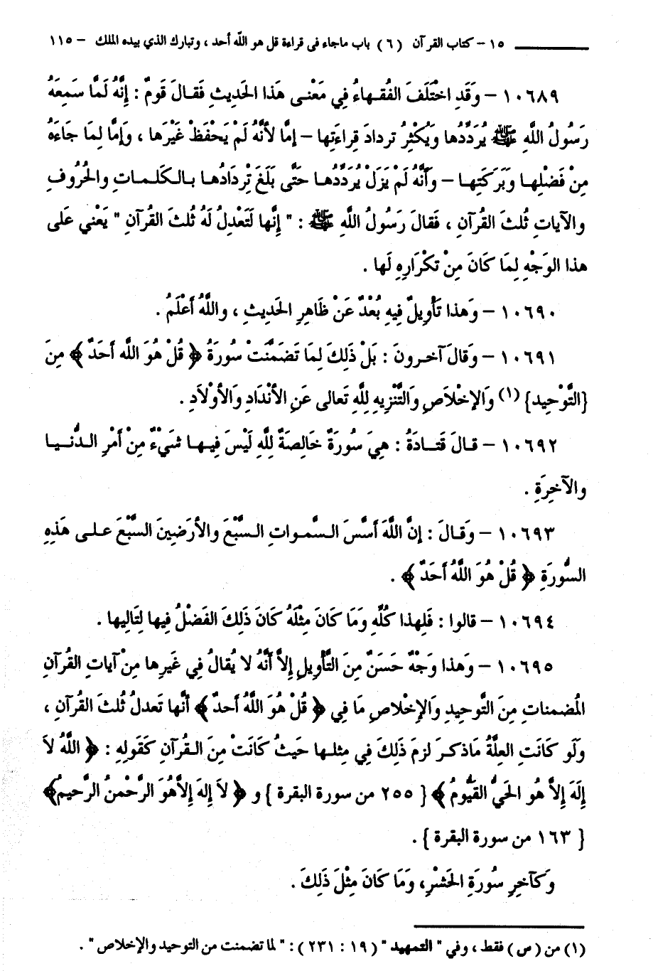 10695 - وَهَذَا وَجْهٌ حَسَنٌ مِنَ التَّأْوِيلِ إِلَّا أَنَّهُ لَا يُقَالُ فِي غَيْرِهَا مِنْ آيَاتِ الْقُرْآنِ الْمُضَمِّنَاتِ مِنَ التَّوْحِيدِ وَالْإِخْلَاصِ مَا فِي " قُلْ هُوَ اللَّهُ أَحَدٌ " أَنَّهَا تَعْدِلُ ثُلُثَ الْقُرْآنِ، وَلَوْ كَانَتِ الْعِلَّةُ مَا ذَكَرَ لَزِمَ ذَلِكَ فِي مِثْلِهَا حَيْثُ كَانَتْ مِنَ الْقُرْآنِ كَقَوْلِهِ: "اللَّهُ لَا إِلَهَ إِلَّا هُوَ الْحَيُّ الْقَيُّومُ " 255 مِنْ سُورَةِ الْبَقَرَةِ وَ "لَا إِلَهَ إِلَّا هُوَ الرَّحْمَنُ الرَّحِيمُ " 163 مِنْ سُورَةِ الْبَقَرَةِ، وَكَآخَرِ سُورَةِ الْحَشْرِ، وَمَا كَانَ مِثْلَ ذَلِكَ.