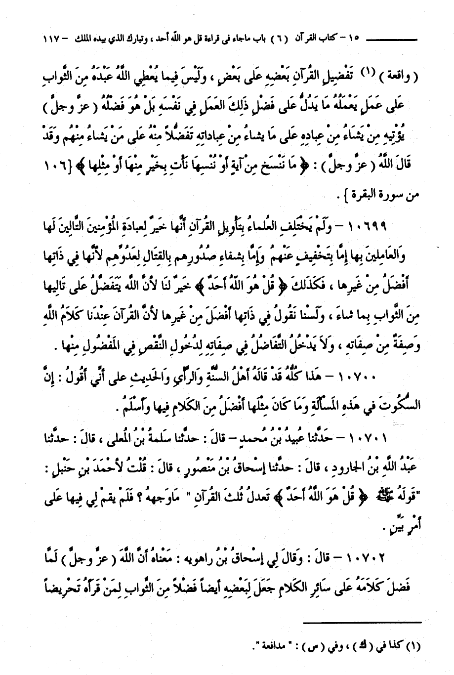 10701 - حَدَّثَنَا عُبَيْدُ بْنُ مُحَمَّدٍ قَالَ: حَدَّثَنَا سَلَمَةُ بْنُ الْمُعَلَّى قَالَ: حَدَّثَنَا عَبْدُ اللَّهِ بْنُ الْجَارُودِ قَالَ: حَدَّثَنَا إِسْحَاقُ بْنُ مَنْصُورٍ قَالَ: قُلْتُ لِأَحْمَدَ بْنِ حَنْبَلٍ: قَوْلُهُ "قُلْ هُوَ اللَّهُ أَحَدٌ " تَعْدِلُ ثُلُثَ الْقُرْآنِ، مَا وَجْهُهُ ؟ فَلَمْ يَقُمْ لِي فِيهَا عَلَى أَمْرٍ بَيِّنٍ.