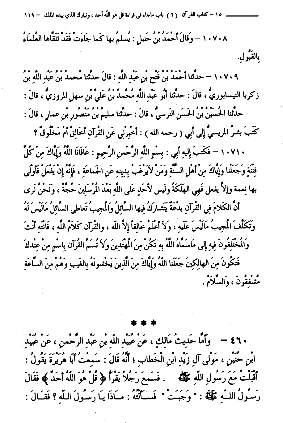 10710 - فَكَتَبَ إِلَيْهِ أَبِي: بِسْمِ اللَّهِ الرَّحْمَنِ الرَّحِيمِ، عَافَانَا اللَّهُ وَإِيَّاكَ مِنْ كُلِّ فِتْنَةٍ وَجَعَلَنَا وَإِيَّاكَ مِنْ أَهْلِ السُّنَّةِ وَمَنْ لَا يَرْغَبُ بِدِينِهِ عَنِ الْجَمَاعَةِ، فَإِنَّهُ إِنْ يَفْعَلْ فَأَوْلَى بِهَا نِعْمَةٌ وَإِلَّا يَفْعَلُ فَهِيَ الْهَلَكَةُ، وَلَيْسَ لِأَحَدٍ عَلَى اللَّهِ بَعْدَ الْمُرْسَلِينَ حُجَّةٌ، وَنَحْنُ نَرَى أَنَّ الْكَلَامَ فِي الْقُرْآنِ بِدْعَةٌ يَتَشَارَكُ فِيهَا السَّائِلُ وَالْمُجِيبُ، تَعَاطَى السَّائِلُ مَا لَيْسَ لَهُ، وَتَكَلَّفَ الْمُجِيبُ مَا لَيْسَ عَلَيْهِ، وَلَا أَعْلَمُ خَالِقًا إِلَّا اللَّهُ، وَالْقُرْآنُ كَلَامُ اللَّهِ، فَانْتَهِ أَنْتَ وَالْمُخْتَلِفُونَ فِيهِ إِلَى مَا سَمَّاهُ اللَّهُ بِهِ، تَكُنْ مِنَ الْمُهْتَدِينَ، وَلَا تُسَمِّ الْقُرْآنَ بِاسْمٍ مِنْ عِنْدِكَ فَتَكُونُ مِنَ الْهَالِكِينَ، جَعَلَنَا اللَّهُ وَإِيَّاكَ مِنَ الَّذِينَ يَخْشَوْنَهُ بِالْغَيْبِ وَهُمْ مِنَ الِسَاعَةِ مُشْفِقُونَ، وَالسَّلَامُ.