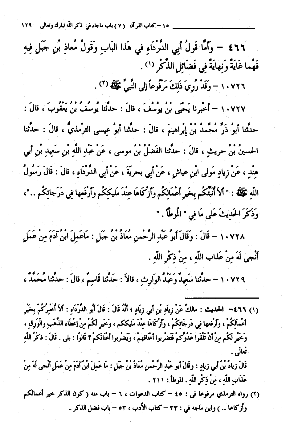 466 - وَأَمَّا قَوْلُ أَبِي الدَّرْدَاءِ فِي هَذَا الْبَابِ، وَقَوْلُ مُعَاذِ بْنِ جَبَلٍ فِيهِ فَهُمَا غَايَةٌ وَنِهَايَةٌ فِي فَضَائِلِ الذِّكْرِ.