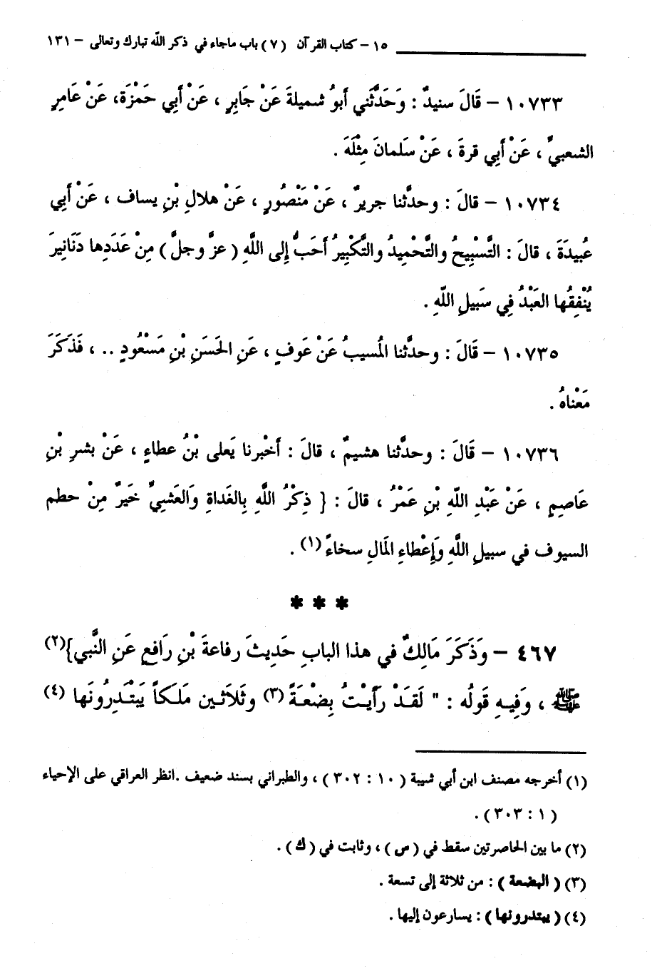 10734 - قَالَ: وَحَدَّثَنَا جَرِيرٌ عَنْ مَنْصُورٍ عَنْ هِلَالِ بْنِ يِسَافٍ عَنْ أَبِي عُبَيْدَةَ قَالَ: التَّسْبِيحُ وَالتَّحْمِيدُ وَالتَّكْبِيرُ أَحَبُّ إِلَى اللَّهِ ( عَزَّ وَجَلَّ ) مِنْ عَدَدِهَا دَنَانِيرَ يُنْفِقُهَا الْعَبْدُ فِي سَبِيلِ اللَّهِ.