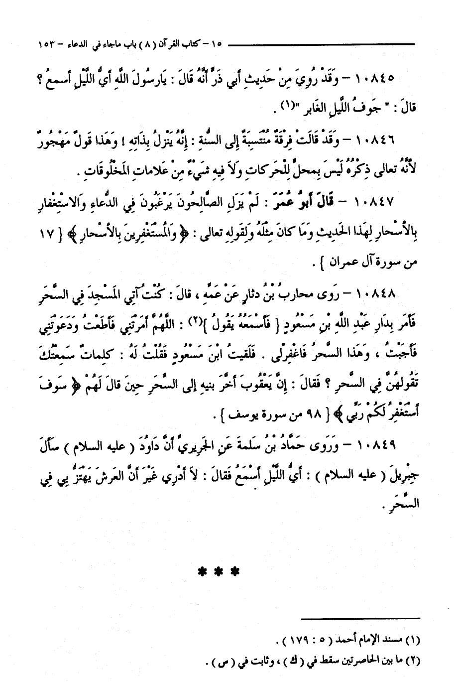 10847 - قَالَ أَبُو عُمَرَ: لَمْ يَزَلِ الصَّالِحُونَ يَرْغَبُونَ فِي الدُّعَاءِ وَالِاسْتِغْفَارِ بِالْأَسْحَارِ لِهَذَا الْحَدِيثِ وَمَا كَانَ مِثْلُهُ وَلِقَوْلِهِ تَعَالَى: "وَالْمُسْتَغْفِرِينَ بِالْأَسْحَارِ: آلِ عِمْرَانَ 17.