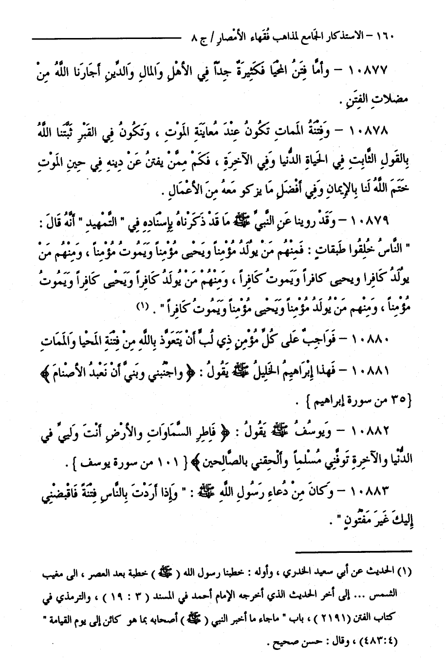 10878 - وَفِتْنَةُ الْمَمَاتِ تَكُونُ عِنْدَ مُعَايَنَةِ الْمَوْتِ وَتَكُونُ فِي الْقَبْرِ، ثَبَّتَنَا اللَّهُ بِالْقَوْلِ الثَّابِتِ فِي الْحَيَاةِ الدُّنْيَا وَفِي الْآخِرَةِ، فَكَمْ مِمَّنْ يُفْتَنُ عَنْ دِينِهِ فِي حِينِ الْمَوْتِ خَتَمَ اللَّهُ لَنَا بِالْإِيمَانِ وَفِي أَفْضَلِ مَا يَزْكُو مَعَهُ مِنَ الْأَعْمَالِ.
