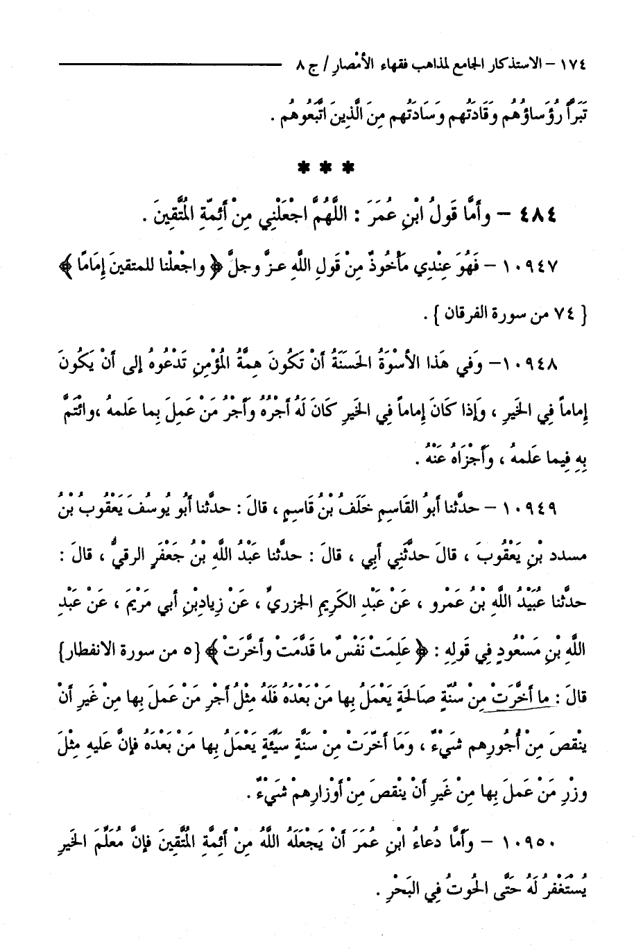 484 - وَأَمَّا قَوْلُ ابْنِ عُمَرَ: اللَّهُمَّ اجْعَلْنِي مِنْ أَئِمَّةِ الْمُتَّقِينَ.