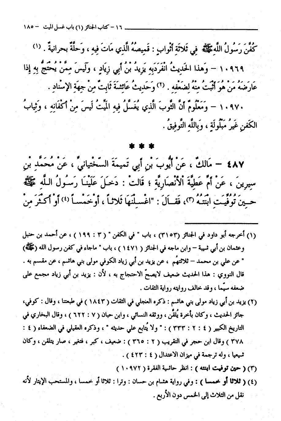 487 - مَالِكٌ عَنْ أَيُّوبَ بْنِ أَبِي تَمِيمَةَ السِّخْتِيَانِيِّ عَنْ مُحَمَّدِ بْنِ سِيرِينَ عَنْ أُمِّ عَطِيَّةَ الْأَنْصَارِيَّةِ، أَنَّهَا قَالَتْ: دَخَلَ عَلَيْنَا رَسُولُ اللَّهِ صَلَّى اللَّهُ عَلَيْهِ وَسَلَّمَ حِينَ تُوُفِّيَتِ ابْنَتُهُ فَقَالَ: اغْسِلْنَهَا ثَلَاثًا أَوْ خَمْسًا أَوْ أَكْثَرَ مِنْ