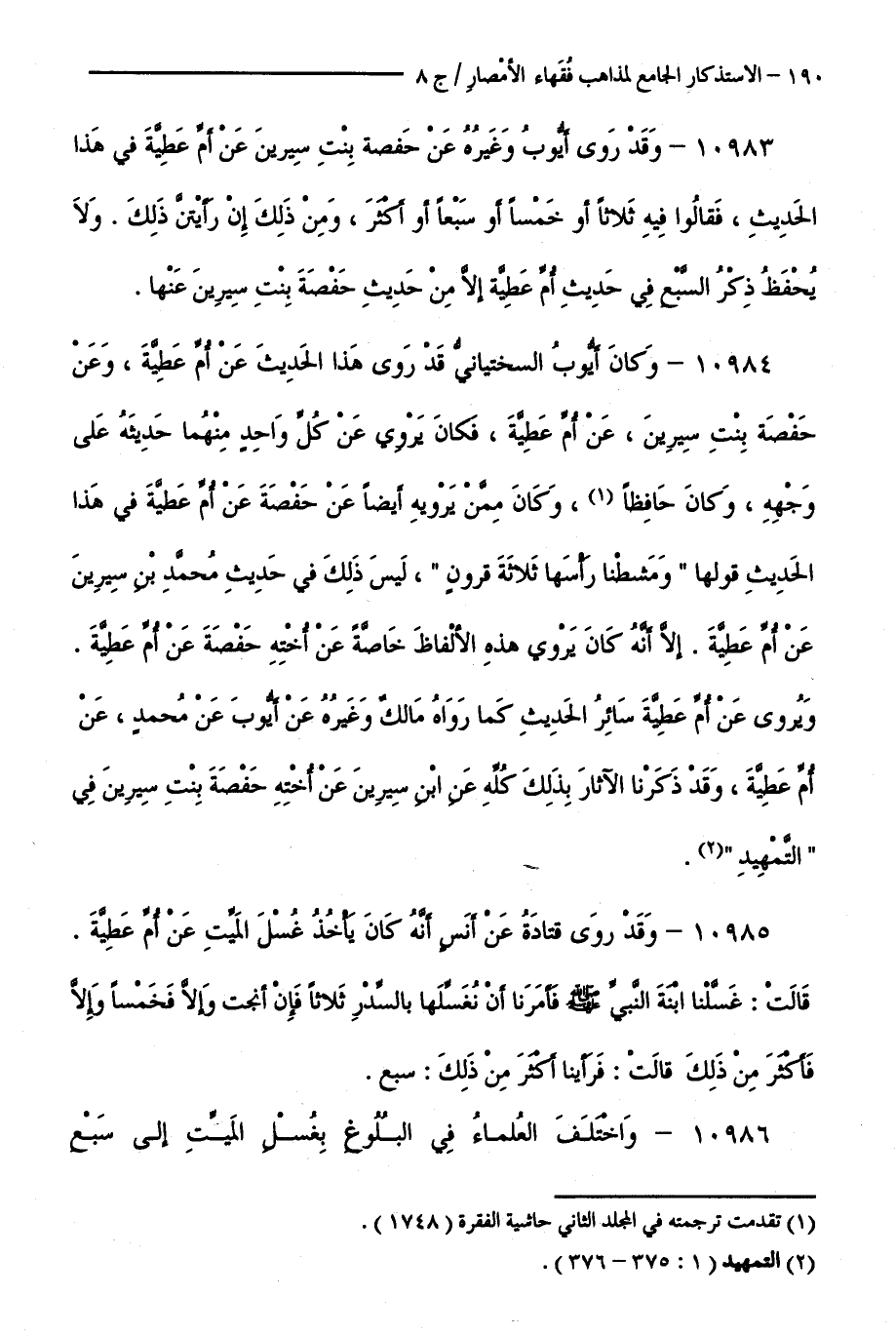 10984 - وَكَانَ أَيُّوبُ السِّخْتِيَانِيُّ قَدْ رَوَى هَذَا الْحَدِيثَ عَنْ أُمِّ عَطِيَّةَ، وَعَنْ حَفْصَةَ بِنْتِ سِيرِينَ عَنْ أُمِّ عَطِيَّةَ فَكَانَ يَرْوِي عَنْ كُلِّ وَاحِدٍ مِنْهُمَا حَدِيثَهُ عَلَى وَجْهِهِ وَكَانَ حَافِظًا وَكَانَ مِمَّنْ يَرْوِيهِ أَيْضًا عَنْ حَفْصَةَ عَنْ أُمِّ عَطِيَّةَ فِي هَذَا الْحَدِيثِ قَوْلُهَا: " وَمَشَّطْنَا رَأْسَهَا ثَلَاثَةَ قُرُونٍ "، لَيْسَ ذَلِكَ فِي حَدِيثِ مُحَمَّدِ بْنِ سِيرِينَ عَنْ أُمِّ عَطِيَّةَ إِلَّا أَنَّهُ كَانَ يَرْوِي هَذِهِ الْأَلْفَاظَ خَاصَّةً عَنْ أُخْتِهِ حَفْصَةَ عَنْ أُمِّ عَطِيَّةَ وَيَرْوِي عَنْ أُمِّ عَطِيَّةَ سَائِرَ الْحَدِيثِ كَمَا رَوَاهُ مَالِكٌ وَغَيْرُهُ عَنْ أَيُّوبَ عَنْ مُحَمَّدِ عَنْ أُمِّ عَطِيَّةَ، وَقَدْ ذَكَرْنَا الْآثَارَ بِذَلِكَ كُلِّهِ عَنِ ابْنِ سِيرِينَ عَنْ أُخْتِهِ حَفْصَةَ بِنْتِ سِيرِينَ فِي ( التَّمْهِيدِ ).