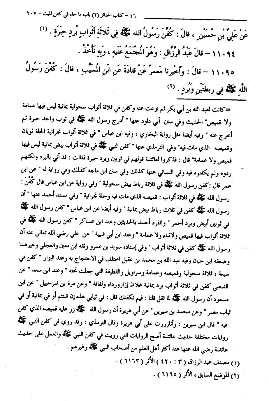 11095 - قَالَ: وَأَخْبَرَنَا مَعْمَرٌ عَنْ قَتَادَةَ عَنِ ابْنِ الْمُسَيَّبِ قَالَ: كُفِّنَ رَسُولُ اللَّهِ صَلَّى اللَّهُ عَلَيْهِ وَسَلَّمَ فِي رَيْطَتَيْنِ وَبُرْدٍ.
