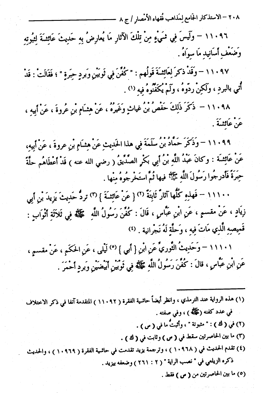 11097 - وَقَدْ ذُكِرَ لِعَائِشَةَ قَوْلُهُمْ " كُفِّنَ فِي ثَوْبَيْنِ وَبُرْدٍ حِبَرَةٍ " فَقَالَتْ: قَدْ أُتِيَ بِالْبُرْدِ وَلَكِنْ رَدُّوهُ وَلَمْ يُكَفِّنُوهُ فِيهِ.