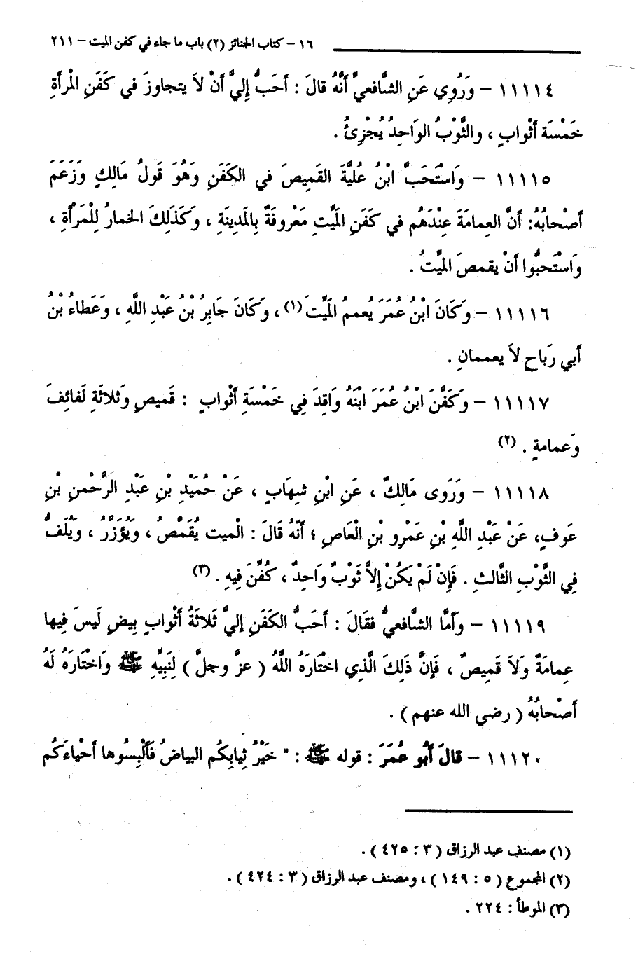 11117 - وَكَفَّنَ ابْنُ عُمَرَ ابْنَهُ وَاقِدًا فِي خَمْسَةِ أَثْوَابٍ، قَمِيصٍ وَثَلَاثِ لَفَائِفَ وَعِمَامَةٍ.