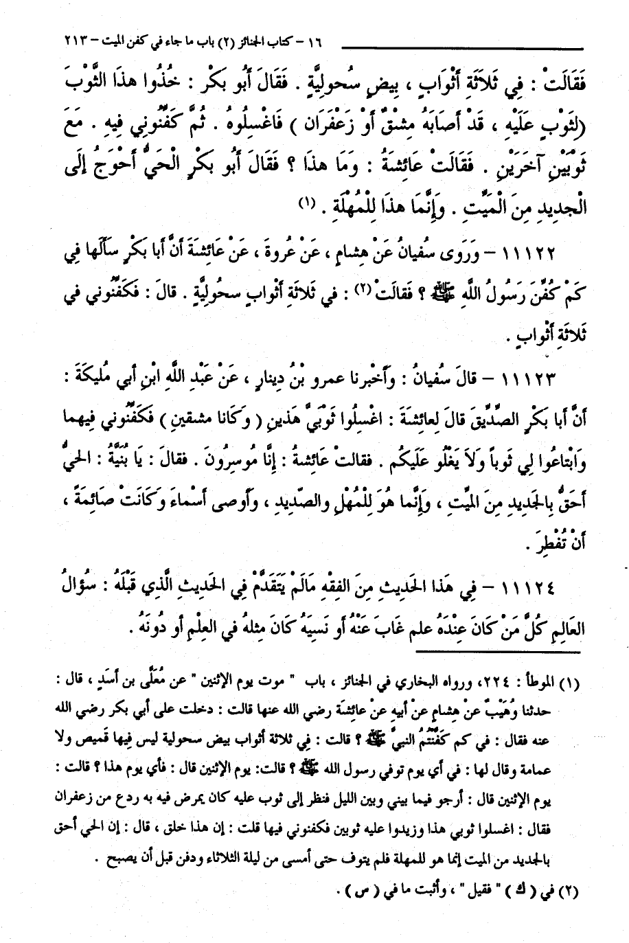 11122 - وَرَوَى سُفْيَانُ عَنْ هِشَامٍ عَنْ عُرْوَةَ عَنْ عَائِشَةَ أَنَّ أَبَا بَكْرٍ سَأَلَهَا: فِي كَمْ كُفِّنَ رَسُولُ اللَّهِ صَلَّى اللَّهُ عَلَيْهِ وَسَلَّمَ ؟ فَقَالَتْ: فِي ثَلَاثَةِ أَثْوَابٍ سَحُولِيَّةٍ قَالَ: فَكَفِّنُونِي فِي ثَلَاثَةِ أَثْوَابٍ.