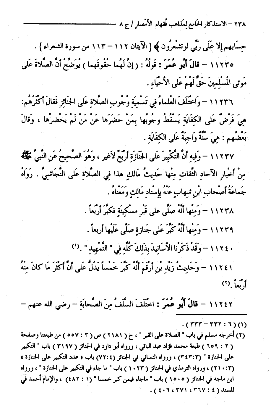 11237 - وَفِيهِ أَنَّ التَّكْبِيرَ عَلَى الْجِنَازَةِ أَرْبَعٌ لَا غَيْرَ وَهُوَ الصَّحِيحُ عَنِ النَّبِيِّ صَلَّى اللَّهُ عَلَيْهِ وَسَلَّمَ مِنْ أَخْبَارِ الْآحَادِ الثِّقَاتِ، مِنْهَا حَدِيثُ مَالِكٍ هَذَا فِي الصَّلَاةِ عَلَى النَّجَاشِيِّ رَوَاهُ جَمَاعَةُ أَصْحَابِ ابْنِ شِهَابٍ عَنْهُ بِإِسْنَادِ مَالِكٍ وَمَعْنَاهُ.