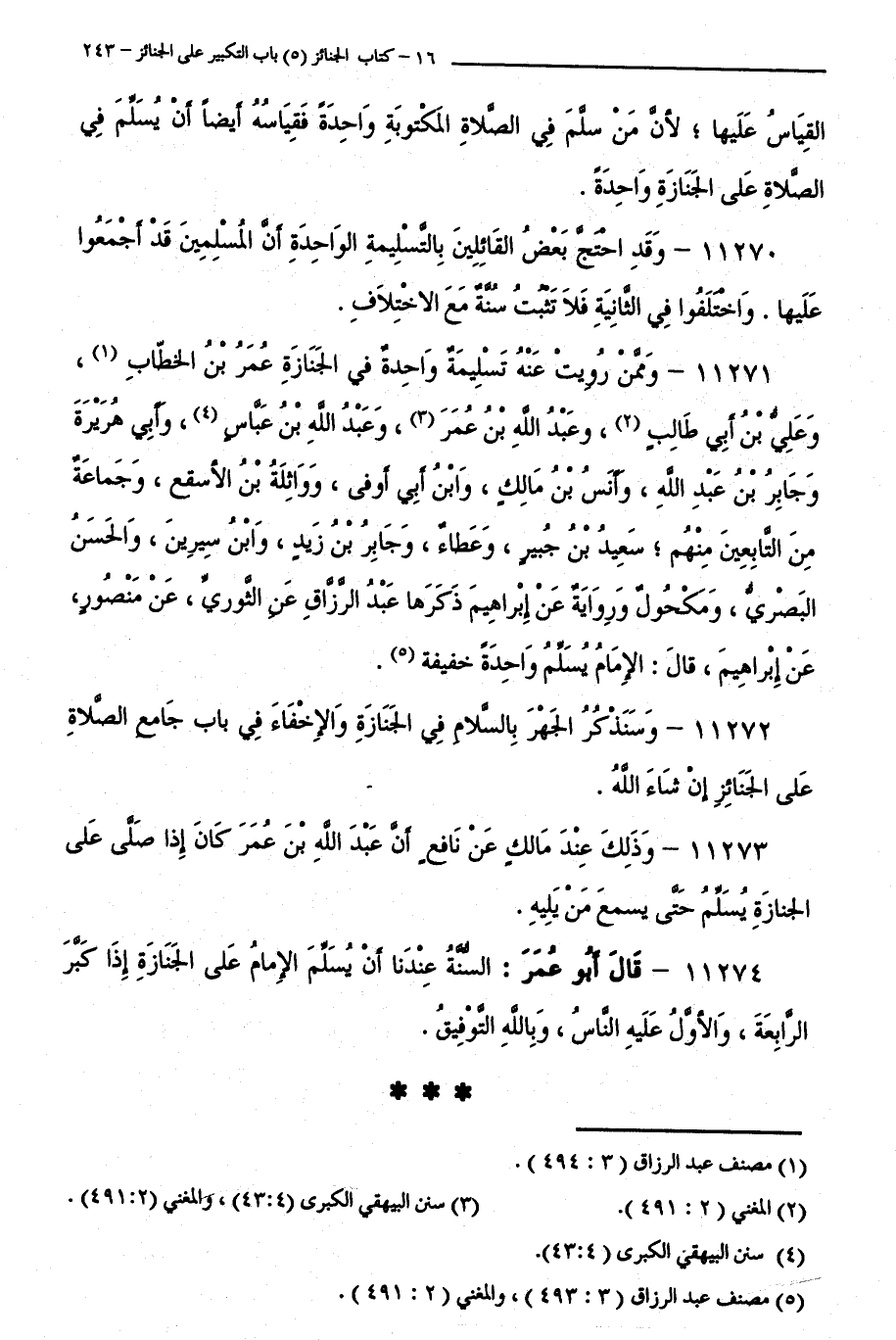 11271 - وَمِمَّنْ رُوِيَتْ عَنْهُ تَسْلِيمَةٌ وَاحِدَةٌ فِي الْجِنَازَةِ عُمَرُ بْنُ الْخَطَّابِ، وَعَلِيُّ بْنُ أَبِي طَالِبٍ، وَعَبْدُ اللَّهِ بْنُ عُمَرَ، وَعَبْدُ اللَّهِ بْنُ عَبَّاسٍ، وَأَبُو هُرَيْرَةَ، وَجَابِرُ بْنُ عَبْدِ اللَّهِ، وَأَنَسُ بْنُ مَالِكٍ، وَابْنُ أَبِي أَوْفَى، وَوَاثِلَةُ بْنُ الْأَسْقَعِ، وَجَمَاعَةٌ مِنَ التَّابِعِينَ، مِنْهُمْ سَعِيدُ بْنُ جُبَيْرٍ، وَعَطَاءٌ، وَجَابِرُ بْنُ زَيْدٍ، وَابْنُ سِيرِينَ، وَالْحَسَنُ الْبَصْرِيُّ، وَمَكْحُولٌ، وَرِوَايَةٌ عَنْ إِبْرَاهِيمَ ذَكَرَهَا عَبْدُ الرَّزَّاقِ عَنِ الثَّوْرِيِّ عَنْ مَنْصُورٍ عَنْ إِبْرَاهِيمَ قَالَ: الْإِمَامُ يُسَلِّمُ وَاحِدَةً خَفِيفَةً.