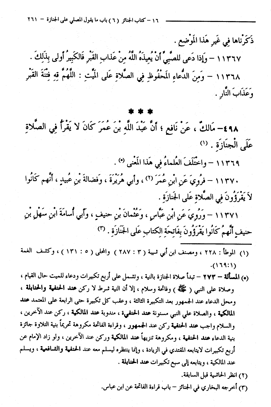 498 - مَالِكٌ عَنْ نَافِعٍ أَنَّ عَبْدَ اللَّهِ بْنَ عُمَرَ كَانَ لَا يَقْرَأُ فِي الصَّلَاةِ عَلَى الْجِنَازَةِ.