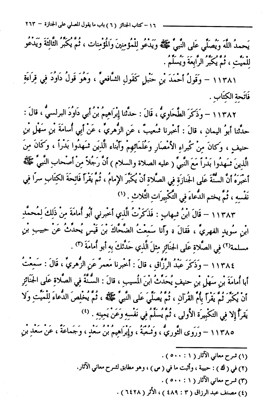 11384 - وَذَكَرَ عَبْدُ الرَّزَّاقِ قَالَ: أَخْبَرَنَا مَعْمَرٌ عَنِ الزُّهْرِيِّ قَالَ: سَمِعْتُ أَبَا أُمَامَةَ بْنَ سَهْلِ بْنِ حُنَيْفٍ يُحَدِّثُ ابْنَ الْمُسَيَّبِ قَالَ: السُّنَّةُ فِي الصَّلَاةِ عَلَى الْجَنَائِزِ أَنْ يُكَبِّرَ، ثُمَّ يَقْرَأُ بِأُمِّ الْقُرْآنِ، ثُمَّ يُصَلِّي عَلَى النَّبِيِّ صَلَّى اللَّهُ عَلَيْهِ وَسَلَّمَ، ثُمَّ يُخْلِصُ الدُّعَاءَ لِلْمَيِّتِ وَلَا يَقْرَأُ إِلَّا فِي التَّكْبِيرَةِ الْأُولَى، ثُمَّ يُسَلِّمُ فِي نَفْسِهِ وَعَنْ يَمِينِهِ.