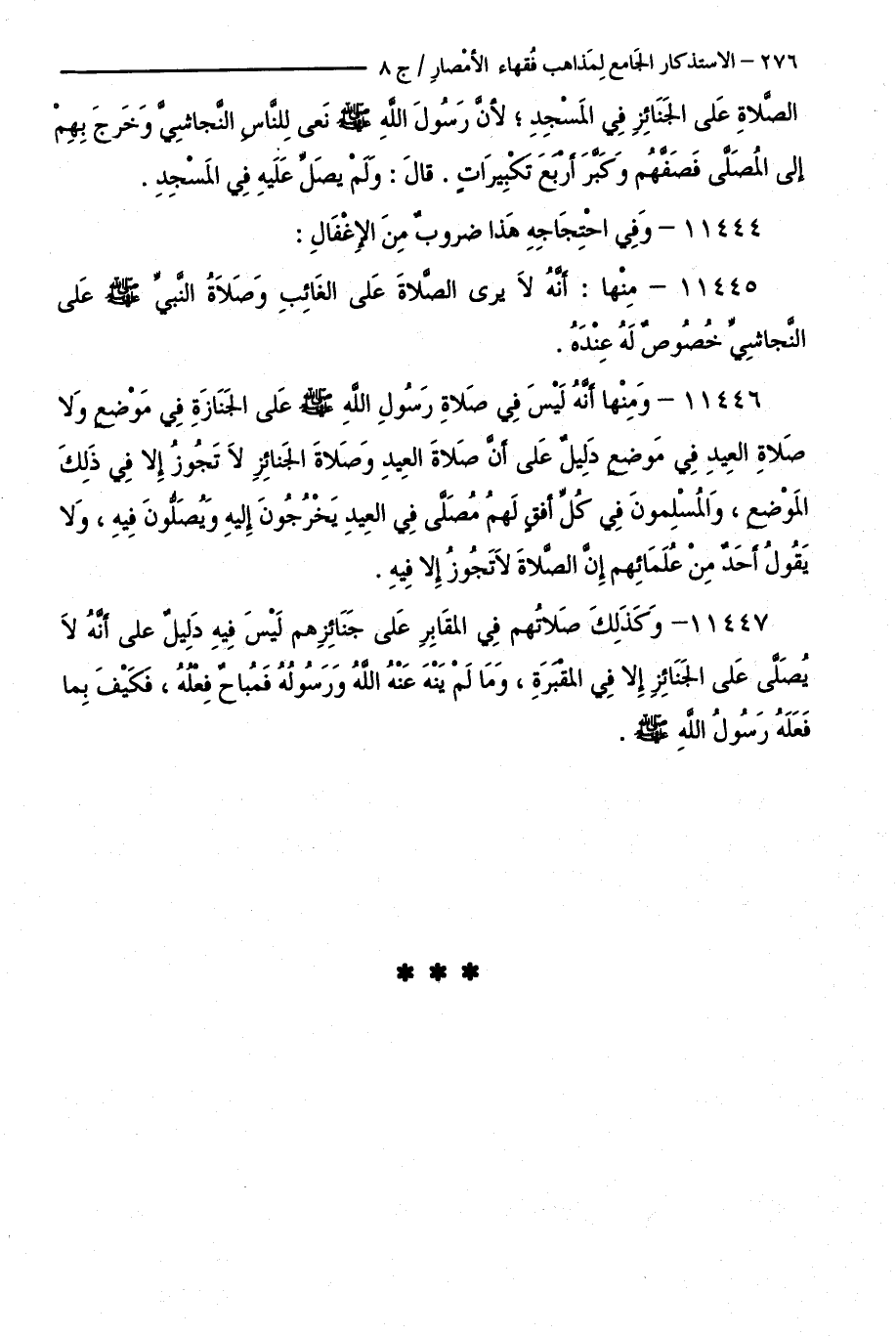 11446 - وَمِنْهَا أَنَّهُ لَيْسَ فِي صَلَاةِ رَسُولِ اللَّهِ صَلَّى اللَّهُ عَلَيْهِ وَسَلَّمَ عَلَى الْجِنَازَةِ فِي مَوْضِعٍ وَلَا صَلَاةِ الْعِيدِ فِي مَوْضِعِ دَلِيلٍ عَلَى أَنَّ صَلَاةَ الْعِيدِ وَصَلَاةَ الْجَنَائِزِ لَا تَجُوزُ إِلَّا فِي ذَلِكَ الْمَوْضِعِ، وَالْمُسْلِمُونَ فِي كُلِّ أُفُقٍ لَهُمْ مُصَلًّى فِي الْعِيدِ يَخْرُجُونَ إِلَيْهِ وَيُصَلُّونَ فِيهِ وَلَا يَقُولُ أَحَدٌ مِنْ عُلَمَائِهِمْ إِنَّ الصَّلَاةَ لَا تَجُوزُ إِلَّا فِيهِ.