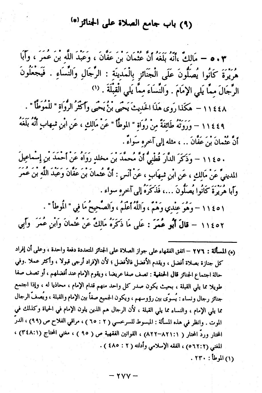 503 - مَالِكٌ، أَنَّهُ بَلَغَهُ أَنَّ عُثْمَانَ بْنَ عَفَّانَ، وَعَبْدَ اللَّهِ بْنَ عُمَرَ، وَأَبَا هُرَيْرَةَ، كَانُوا يُصَلُّونَ عَلَى الْجَنَائِزِ بِالْمَدِينَةِ الرِّجَالِ وَالنِّسَاءِ، فَيَجْعَلُونَ الرِّجَالَ مِمَّا يَلِي الْإِمَامَ وَالنِّسَاءَ مِمَّا يَلِي الْقِبْلَةَ.