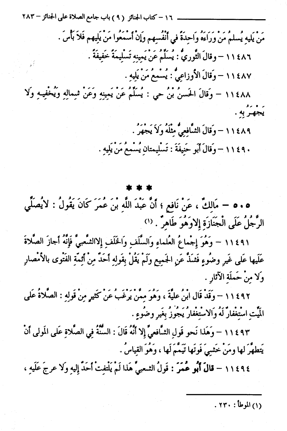 505 - مَالِكٌ عَنْ نَافِعٍ أَنَّ عَبْدَ اللَّهِ بْنَ عُمَرَ كَانَ يَقُولُ: لَا يُصَلِّي الرَّجُلُ عَلَى الْجِنَازَةِ إِلَّا وَهُوَ طَاهِرٌ.