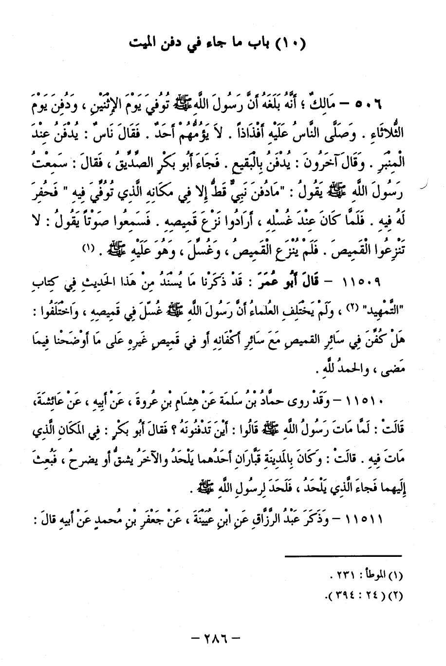 11509 - قَالَ أَبُو عُمَرَ: قَدْ ذَكَرْنَا مَا يُسْنَدُ مِنْ هَذَا الْحَدِيثِ فِي كِتَابِ ( التَّمْهِيدِ ) وَلَمْ يَخْتَلِفِ الْعُلَمَاءُ أَنَّ رَسُولَ اللَّهِ صَلَّى اللَّهُ عَلَيْهِ وَسَلَّمَ غُسِّلَ فِي قَمِيصِهِ، وَاخْتَلَفُوا هَلْ كُفِّنَ فِي سَائِرِ الْقَمِيصِ مَعَ سَائِرِ أَكْفَانِهِ أَوْ فِي قَمِيصٍ غَيْرِهِ عَلَى مَا أَوْضَحْنَا فِيمَا مَضَى وَالْحَمْدُ لِلَّهِ.