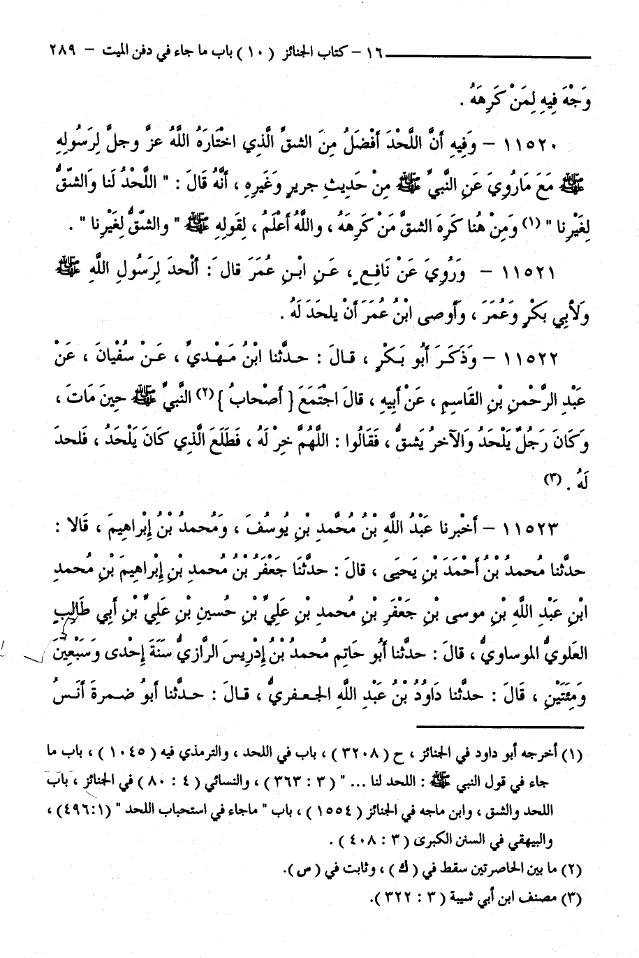 11521 - وَرُوِيَ عَنْ نَافِعٍ عَنِ ابْنِ عُمَرَ قَالَ: أُلْحِدَ لِرَسُولِ اللَّهِ وَلِأَبِي بَكْرٍ وَعُمَرَ وَأَوْصَى ابْنُ عُمَرَ أَنْ يُلْحَدَ لَهُ.