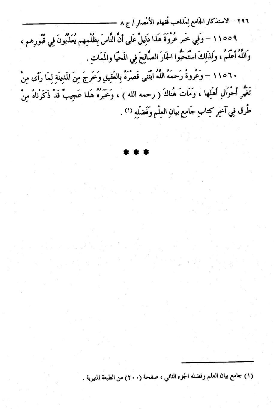 11560 - وَعُرْوَةُ رَحِمَهُ اللَّهُ ابْتَنَى قَصْرَهُ بِالْعَقِيقِ وَخَرَجَ مِنَ الْمَدِينَةِ لَمَّا رَأَى مِنْ تَغَيُّرِ أَحْوَالِ أَهْلِهَا وَمَاتَ هُنَاكَ ( رَحِمَهُ اللَّهُ )، وَخَبَرُهُ هَذَا عَجِيبٌ قَدْ ذَكَرْنَاهُ مَنْ طُرُقٍ فِي آخِرِ كِتَابِ جَامِعِ بَيَانِ الْعَلَمِ وَفَضْلِهِ.