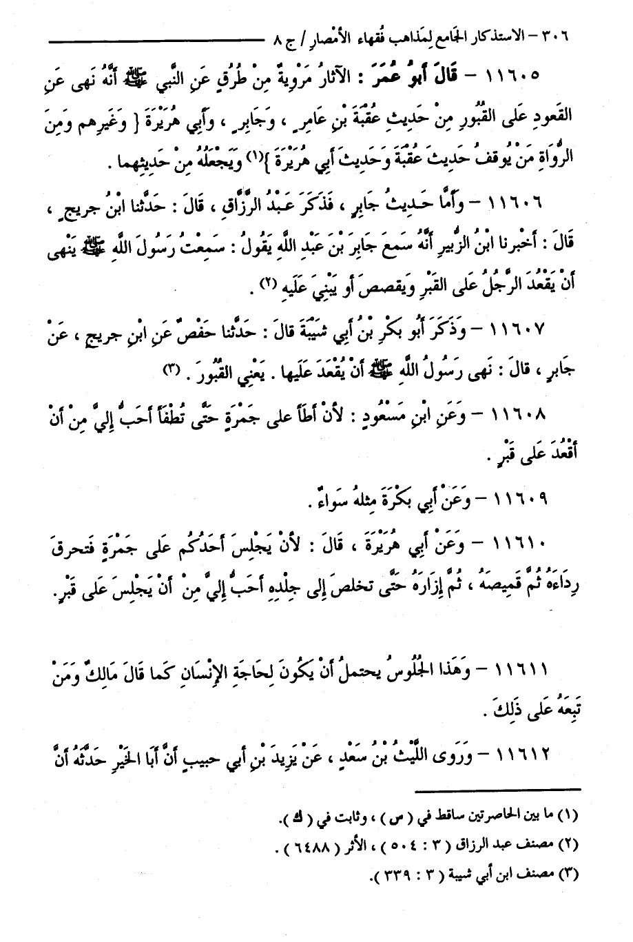 11605 - قَالَ أَبُو عُمَرَ: الْآثَارُ مَرْوِيَّةٌ مِنْ طُرُقٍ عَنِ النَّبِيِّ صَلَّى اللَّهُ عَلَيْهِ وَسَلَّمَ أَنَّهُ نَهَى عَنِ الْقُعُودِ عَلَى الْقُبُورِ مِنْ حَدِيثِ عُقْبَةَ بْنِ عَامِرٍ، وَجَابِرٍ، وَأَبِي هُرَيْرَةَ، وَغَيْرِهِمْ، وَمِنِ الرُّوَاةِ لَهَا مَنْ يُوقِفُ حَدِيثَ عُقْبَةَ، وَحَدِيثَ أَبِي هُرَيْرَةَ، وَيَجْعَلُهُ مِنْ حَدِيثِهِمَا.