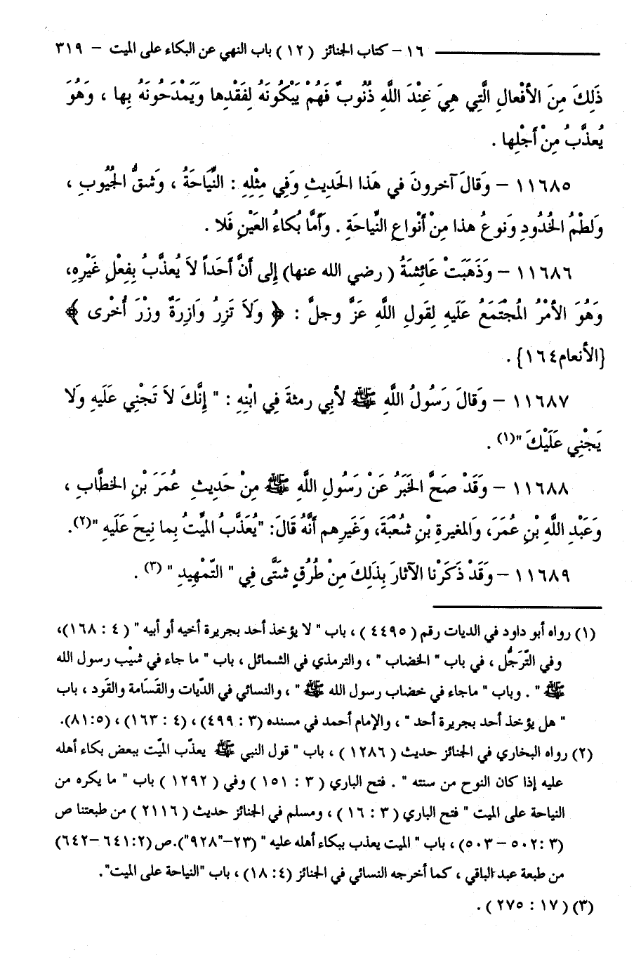 11685 - وَقَالَ آخَرُونَ فِي هَذَا الْحَدِيثِ وَفِي مِثْلِهِ النِّيَاحَةُ وَشَقُّ الْجُيُوبِ وَلَطْمُ الْخُدُودِ وَنَوْعُ هَذَا مِنْ أَنْوَاعِ النِّيَاحَةِ، وَأَمَّا بُكَاءُ الْعَيْنِ فَلَا.