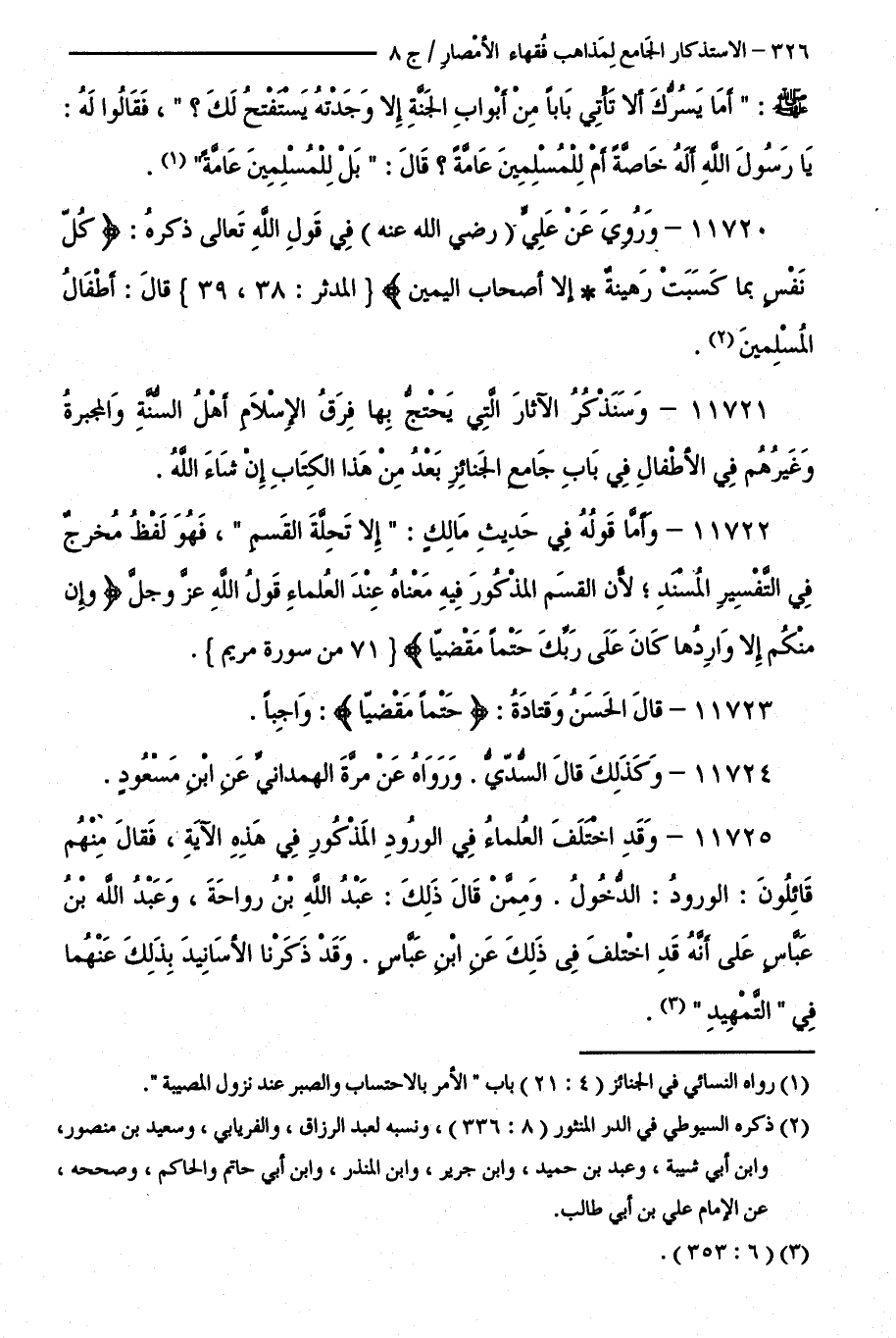 11721 - وَسَنَذْكُرُ الْآثَارَ الَّتِي يَحْتَجُّ بِهَا فِرَقُ الْإِسْلَامِ أَهْلُ السُّنَّةِ وَالْمُجْبِرَةُ وَغَيْرُهُمْ فِي الْأَطْفَالِ فِي بَابِ جَامِعِ الْجَنَائِزِ بَعْدُ مِنْ هَذَا الْكِتَابِ إِنْ شَاءَ اللَّهُ.