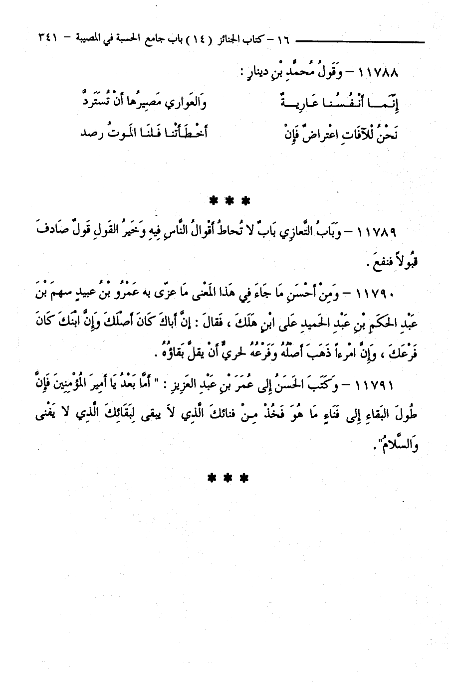 11791 - وَكَتَبَ الْحَسَنُ إِلَى عُمَرَ بْنِ عَبْدِ الْعَزِيزِ: " أَمَّا بَعْدُ يَا أَمِيرَ الْمُؤْمِنِينَ، فَإِنَّ طُولَ الْبَقَاءِ إِلَى فَنَاءٍ مَا هُوَ فَخُذْ مِنْ فَنَائِكَ الَّذِي لَا يَبْقَى لِبَقَائِكَ الَّذِي لَا يَفْنَى وَالسَّلَامُ ".