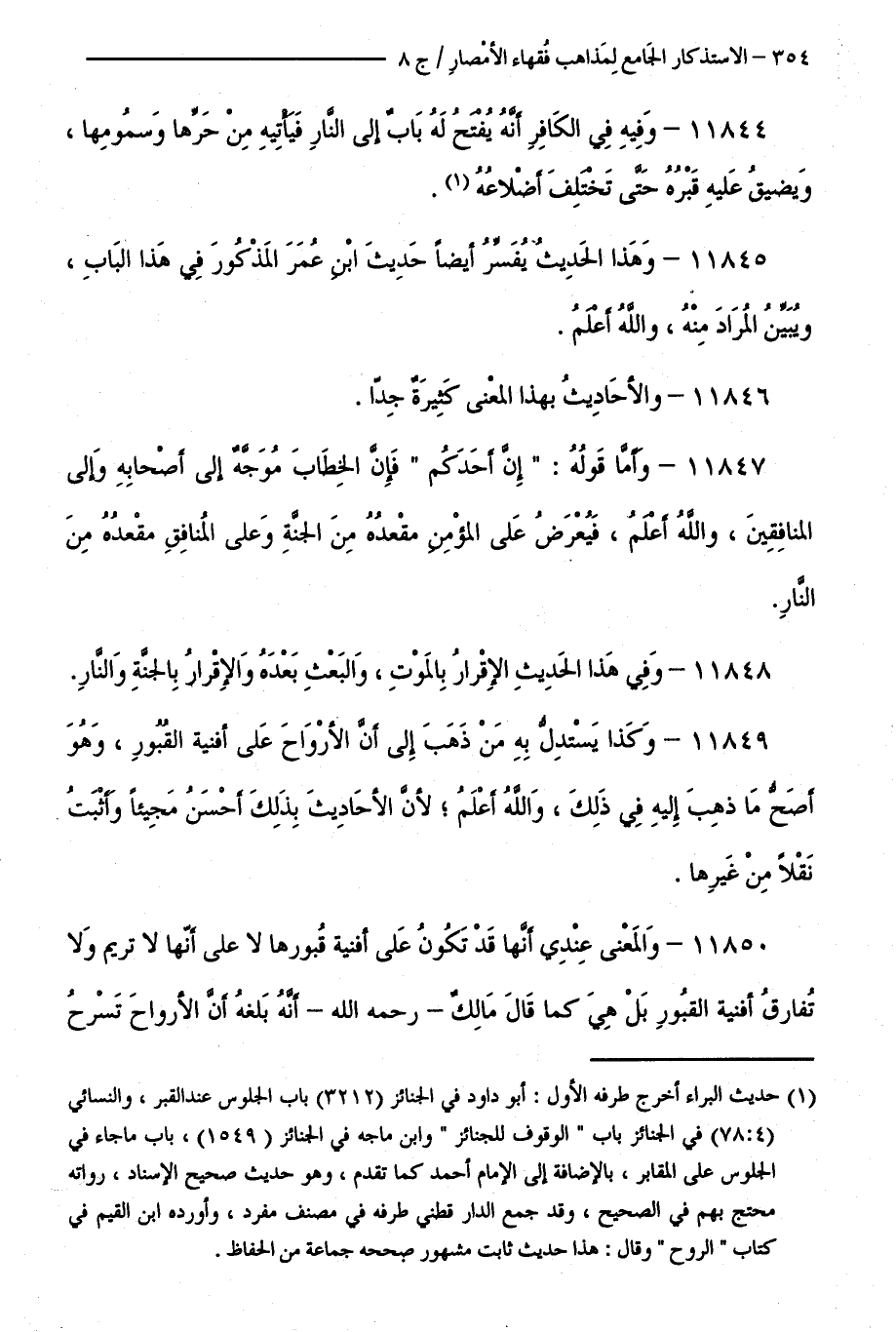 11850 - وَالْمَعْنَى عِنْدِي أَنَّهَا قَدْ تَكُونُ عَلَى أَفَنِيَّةِ قُبُورِهَا لَا عَلَى أَنَّهَا لَا تَرِيمُ وَلَا تُفَارِقُ أَفَنِيَّةَ الْقُبُورِ بَلْ هِيَ كَمَا قَالَ مَالِكٌ - رَحِمَهُ اللَّهُ - أَنَّهُ بَلَغَهُ أَنَّ الْأَرْوَاحَ تَسْرَحُ
