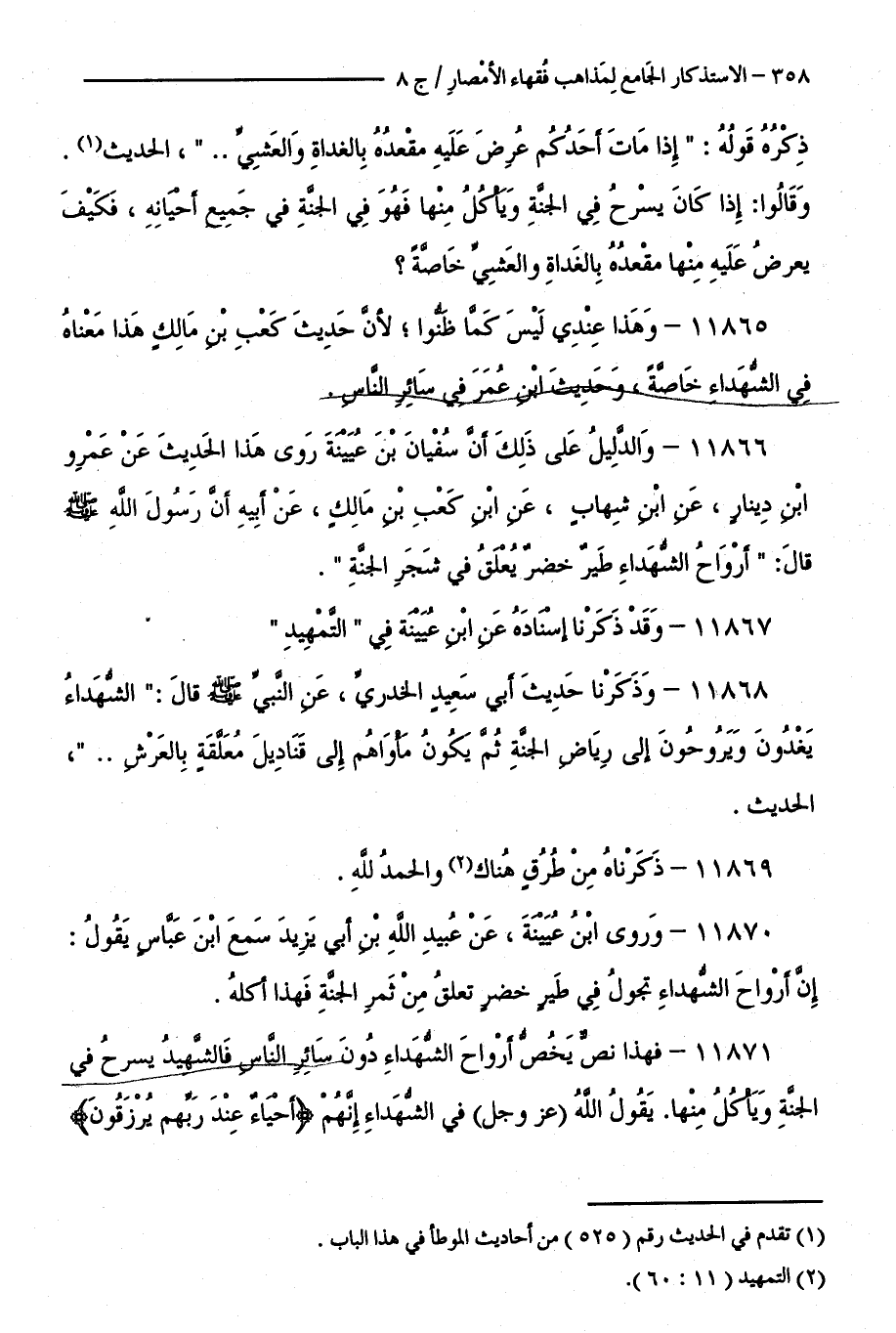 11865 - وَهَذَا عِنْدِي لَيْسَ كَمَا ظَنُّوا، لِأَنَّ حَدِيثَ كَعْبِ بْنِ مَالِكٍ هَذَا مَعْنَاهُ فِي الشُّهَدَاءِ خَاصَّةً، وَحَدِيثُ ابْنِ عُمَرَ فِي سَائِرِ النَّاسِ.