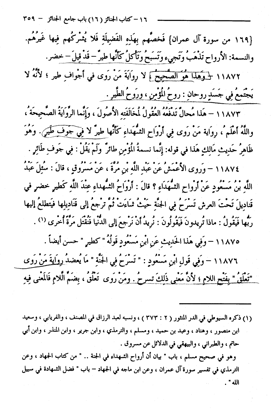 11872 - وَهَذَا هُوَ الصَّحِيحُ لَا رِوَايَةَ مَنْ رَوَى فِي أَجْوَافِ طَيْرٍ لِأَنَّهُ لَا يَجْتَمِعُ فِي جَسَدٍ رُوحَانِ رُوحُ الْمُؤْمِنِ وَرُوحُ الطَّيْرِ.