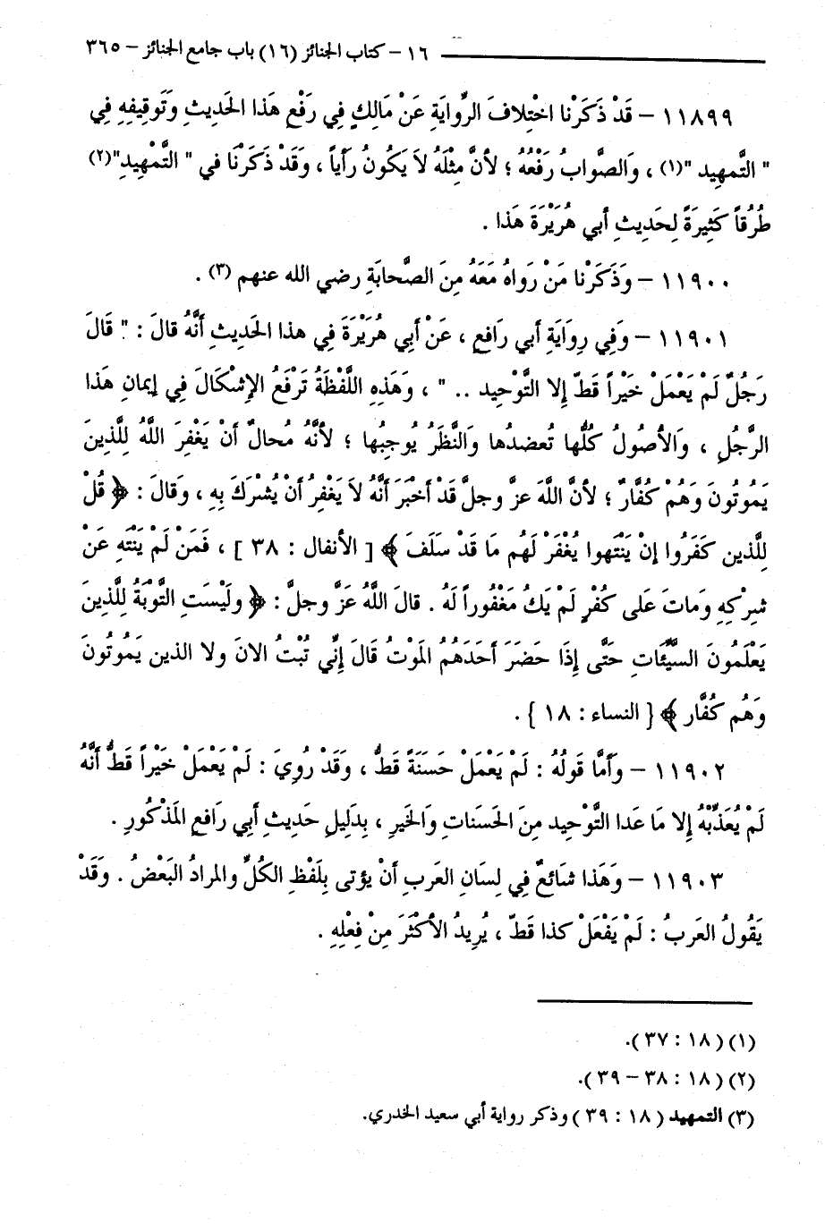 11899 - قَدْ ذَكَرْنَا اخْتِلَافَ الرِّوَايَةِ عَنْ مَالِكٍ فِي رَفْعِ هَذَا الْحَدِيثِ وَتَوْقِيفِهِ فِي ( التَّمْهِيدِ ) وَالصَّوَابُ رَفْعُهُ، لِأَنَّ مِثْلَهُ لَا يَكُونُ رَأْيًا، وَقَدْ ذَكَرْنَا فِي ( التَّمْهِيدِ ) طُرُقًا كَثِيرَةً لِحَدِيثِ أَبِي هُرَيْرَةَ هَذَا.