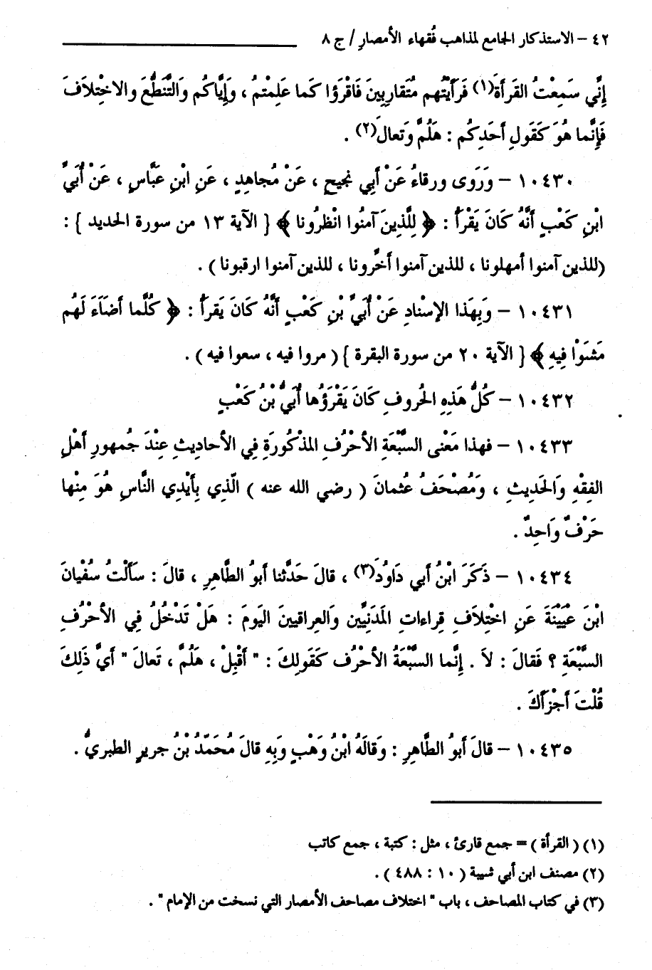 10433 - فَهَذَا مَعْنَى السَّبْعَةِ الْأَحْرُفِ الْمَذْكُورَةِ فِي الْأَحَادِيثِ عِنْدَ جُمْهُورِ أَهْلِ الْفِقْهِ وَالْحَدِيثِ، وَمُصْحَفُ عُثْمَانَ ( رَضِيَ اللَّهُ عَنْهُ ) الَّذِي بِأَيْدِي النَّاسِ هُوَ مِنْهَا حَرْفٌ وَاحِدٌ.