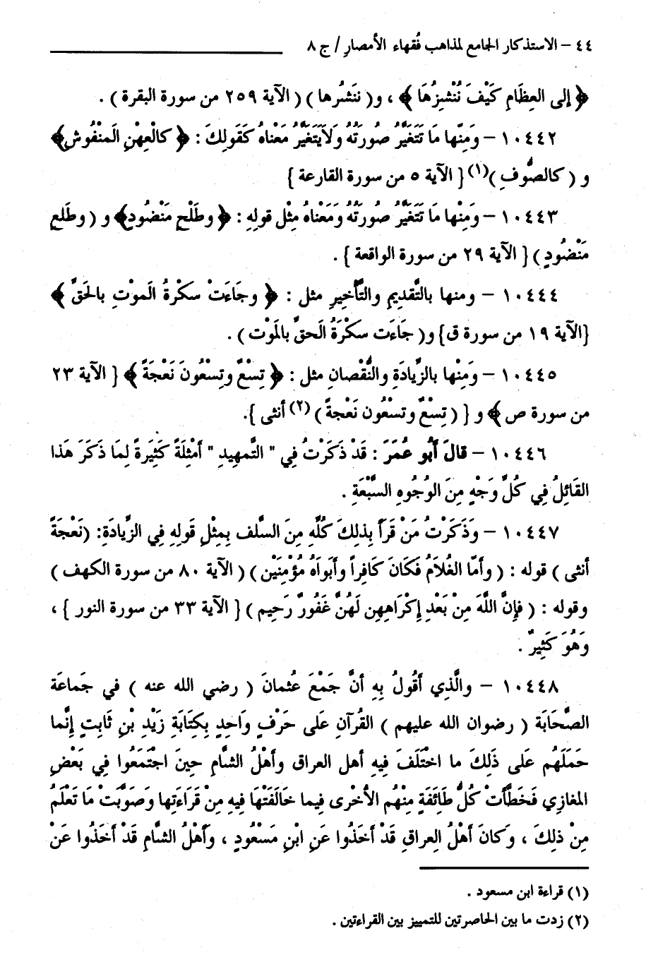 10448 - وَالَّذِي أَقُولُ بِهِ إِنَّ جَمْعَ عُثْمَانَ ( رَضِيَ اللَّهُ عَنْهُ ) فِي جَمَاعَةِ الصَّحَابَةِ ( رِضْوَانُ اللَّهِ عَلَيْهِمْ ) الْقُرْآنَ عَلَى حَرْفٍ وَاحِدٍ بِكِتَابَةِ زَيْدِ بْنِ ثَابِتٍ، إِنَّمَا حَمَلَهُمْ عَلَى ذَلِكَ مَا اخْتَلَفَ فِيهِ أَهْلُ الْعِرَاقِ وَأَهْلُ الشَّامِ حِينَ اجْتَمَعُوا فِي بَعْضِ الْمَغَازِي، فَخَطَّأَتْ كُلُّ طَائِفَةٍ مِنْهُمُ الْأُخْرَى فِيمَا خَالَفَتْهَا فِيهِ مِنْ قِرَاءَتِهَا، وَصَوَّبَتْ مَا تَعْلَمُ مِنْ ذَلِكَ، وَكَانَ أَهْلُ الْعِرَاقِ قَدْ أَخَذُوا عَنِ ابْنِ مَسْعُودٍ وَأَهْلُ الشَّامِ قَدْ أَخَذُوا عَنْ