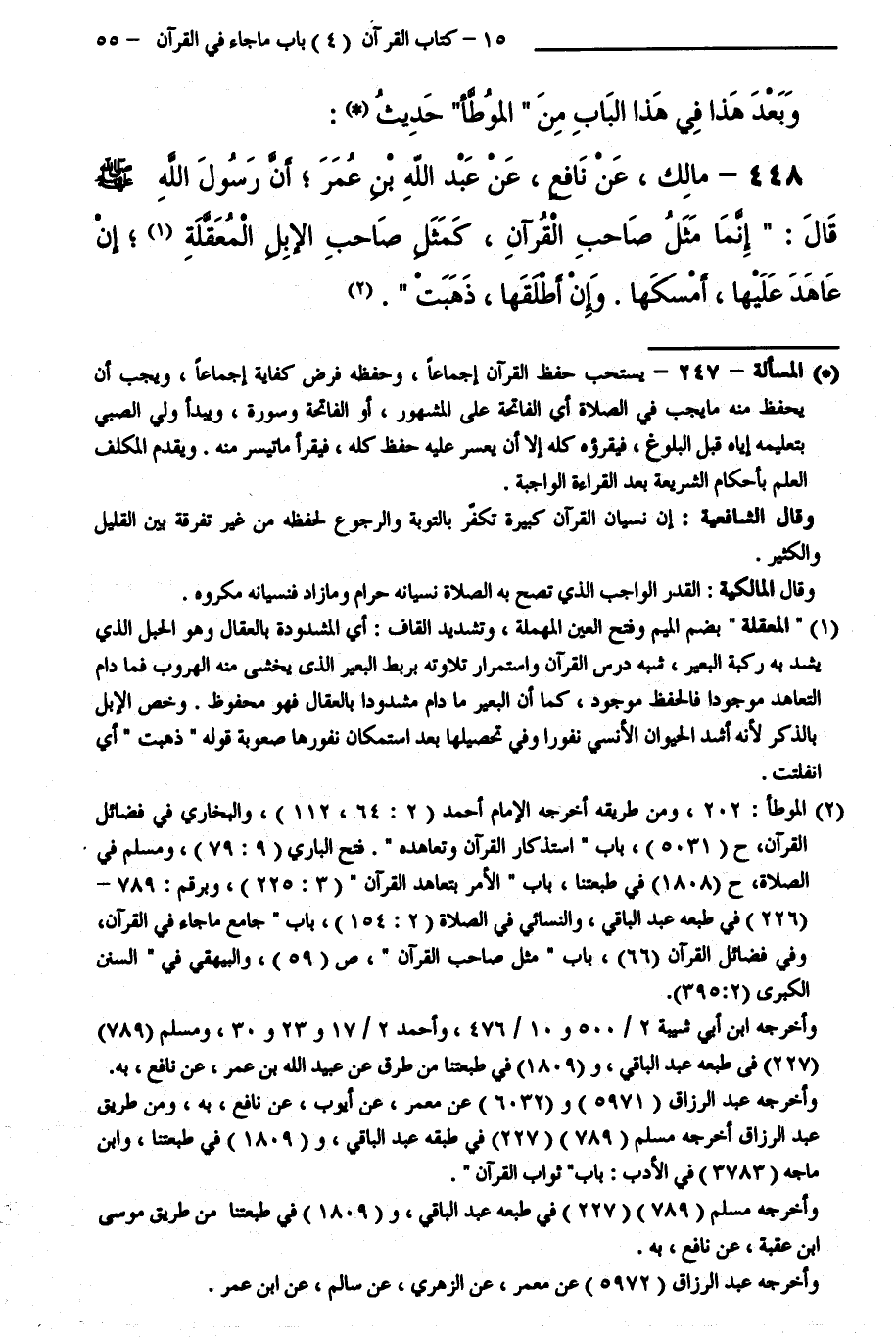 448 - مَالِكٍ عَنْ نَافِعٍ عَنْ عَبْدِ اللَّهِ بْنِ عُمَرَ أَنَّ رَسُولَ اللَّهِ صَلَّى اللَّهُ عَلَيْهِ وَسَلَّمَ قَالَ: "إِنَّمَا مَثَلُ صَاحِبِ الْقُرْآنِ كَمَثَلِ صَاحِبِ الْإِبِلِ الْمُعَقَّلَةِ، إِنْ عَاهَدَ عَلَيْهَا أَمْسَكَهَا، وَإِنْ أَطْلَقَهَا ذَهَبَتْ ".