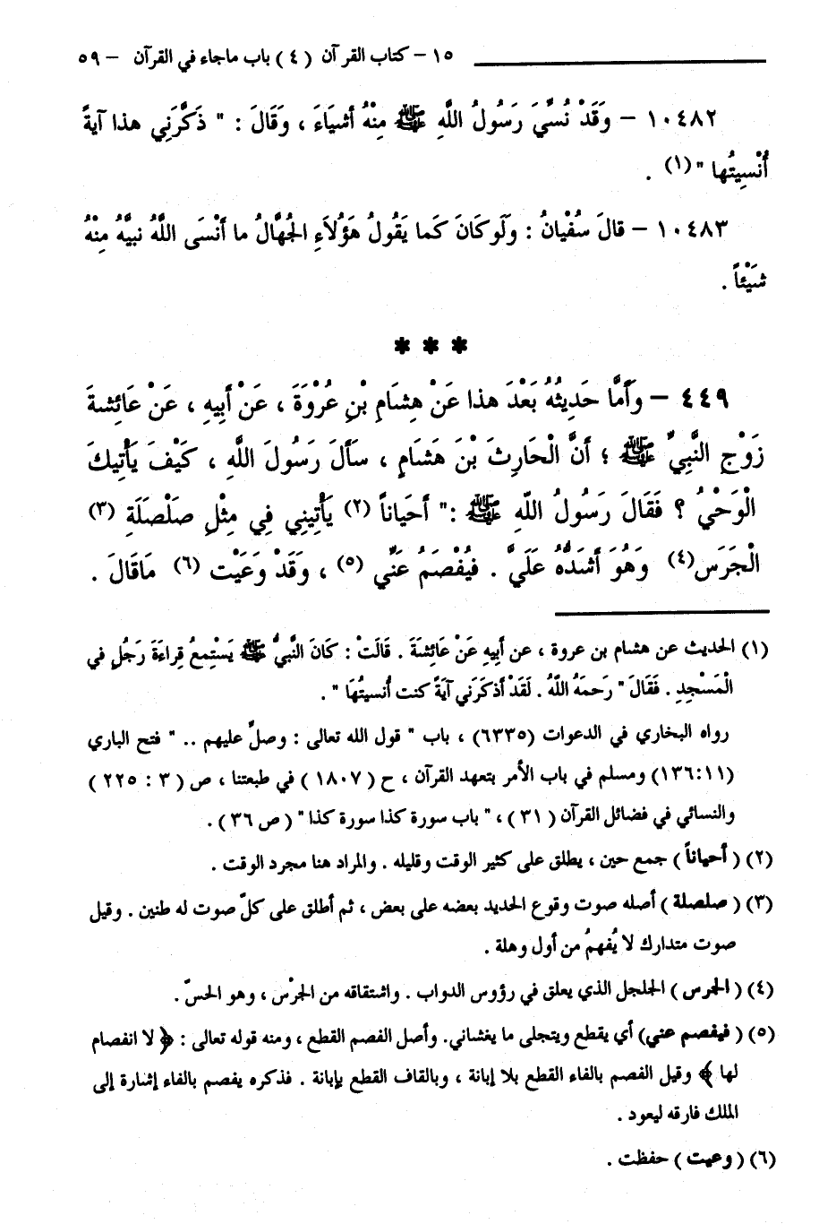 449 - وَأَمَّا حَدِيثُهُ بَعْدَ هَذَا عَنْ هِشَامِ بْنِ عُرْوَةَ عَنْ أَبِيهِ عَنْ عَائِشَةَ زَوْجِ النَّبِيِّ - صَلَّى اللَّهُ عَلَيْهِ وَسَلَّمَ -أَنَّ الْحَارِثَ بْنَ هِشَامٍ سَأَلَ رَسُولَ اللَّهِ صَلَّى اللَّهُ عَلَيْهِ وَسَلَّمَ: كَيْفَ يَأْتِيكَ الْوَحْيُ ؟ فَقَالَ رَسُولُ اللَّهِ، صَلَّى اللَّهُ عَلَيْهِ وَسَلَّمَ: " أَحْيَانًا يَأْتِينِي فِي مِثْلِ صَلْصَلَةِ الْجَرَسِ، وَهُوَ أَشَدُّهُ عَلَيَّ، فَيَفْصِمُ عَنِّي، وَقَدْ وَعَيْتُ مَا قَالَ.