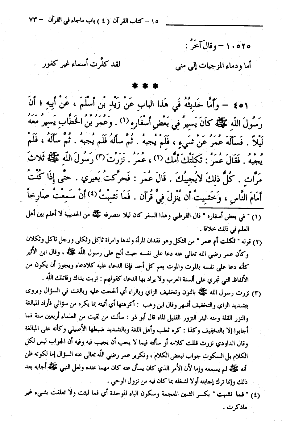 451 - وَأَمَّا حَدِيثُهُ فِي هَذَا الْبَابِ عَنْ زَيْدِ بْنِ أَسْلَمَ عَنْ أَبِيهِأَنَّ رَسُولَ اللَّهِ صَلَّى اللَّهُ عَلَيْهِ وَسَلَّمَ كَانَ يَسِيرُ فِي بَعْضِ أَسْفَارِهِ، وَعُمَرُ بْنُ الْخَطَّابِ يَسِيرُ مَعَهُ لَيْلًا، فَسَأَلَهُ عُمَرُ عَنْ شَيْءٍ فَلَمْ يُجِبْهُ، ثُمَّ سَأَلَهُ فَلَمْ يُجِبْهُ، ثُمَّ سَأَلَهُ فَلَمْ يُجِبْهُ، فَقَالَ عُمَرُ: ثَكِلَتْكَ أُمُّكَ عُمَرُ، نَزَرْتَ رَسُولَ اللَّهِ صَلَّى اللَّهُ عَلَيْهِ وَسَلَّمَ ثَلَاثَ مَرَّاتٍ كُلُّ ذَلِكَ لَا يُجِيبُكَ، قَالَ عُمَرُ: فَحَرَّكْتُ بَعِيرِي حَتَّى إِذَا كُنْتُ أَمَامَ النَّاسِ، وَخَشِيتُ أَنْ يَنْزِلَ فِيَّ قُرْآنٌ، فَمَا نَشِبْتُ أَنْ سَمِعْتُ صَارِخًا