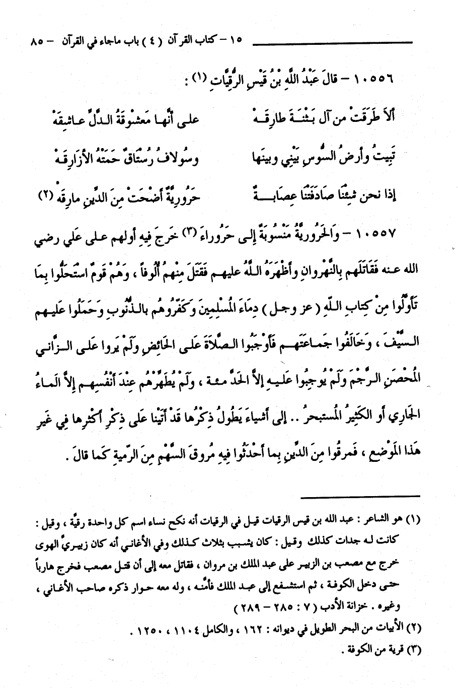 10557 - وَالْحَرُورِيَّةُ مَنْسُوبَةٌ إِلَى حَرُورَاءَ خَرَجَ فِيهِ أَوَّلُهُمْ عَلَى عَلِيٍّ رَضِيَ اللَّهُ عَنْهُ فَقَاتَلَهُمْ بِالنَّهْرَوَانِ وَأَظْهَرَهُ اللَّهُ عَلَيْهِمْ فَقَتَلَ مِنْهُمْ أُلُوفًا، وَهُمْ قَوْمٌ اسْتَحَلُّوا بِمَا تَأَوَّلُوا مِنْ كِتَابِ اللَّهِ ( عَزَّ وَجَلَّ ) دِمَاءَ الْمُسْلِمِينَ وَكَفَّرُوهُمْ بِالذُّنُوبِ وَحَمَلُوا عَلَيْهِمُ السَّيْفَ وَخَالَفُوا جَمَاعَتَهُمْ فَأَوْجَبُوا الصَّلَاةَ عَلَى الْحَائِضِ، وَلَمْ يَرَوْا عَلَى الزَّانِي الْمُحْصَنِ الرَّجْمَ، وَلَمْ يُوجِبُوا عَلَيْهِ إِلَّا الْحَدَّ مِائَةً، وَلَمْ يُطَهِّرْهُمْ عِنْدَ أَنْفُسِهِمْ إِلَّا الْمَاءُ الْجَارِي أَوِ الْكَثِيرُ الْمُسْتَبْحِرُ إِلَى أَشْيَاءَ يُطُولُ ذِكْرُهَا قَدْ أَتَيْنَا عَلَى ذِكْرِ أَكْثَرِهَا فِي غَيْرِ هَذَا الْمَوْضِعِ فَمَرَقُوا مِنَ الدِّينِ بِمَا أَحْدَثُوا فِيهِ مُرُوقَ السَّهْمِ مِنَ الرَّمِيَّةِ كَمَا قَالَ.