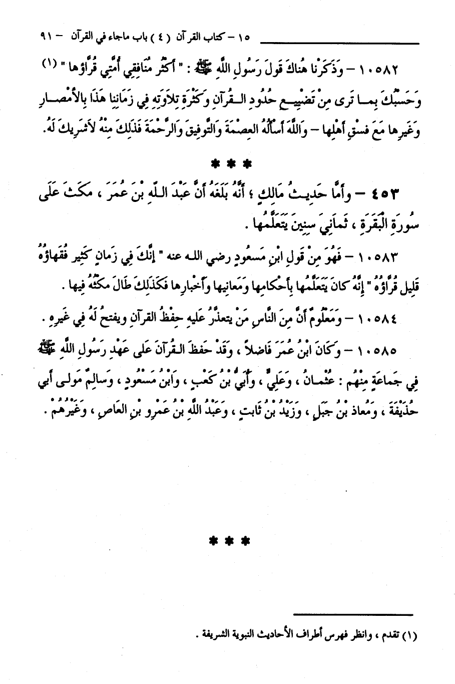 453 - وَأَمَّا حَدِيثُ مَالِكٍ أَنَّهُ بَلَغَهُ أَنَّ عَبْدَ اللَّهِ بْنَ عُمَرَ مَكَثَ عَلَى سُورَةِ الْبَقَرَةِ ثَمَانِي سِنِينَ يَتَعَلَّمُهَا.