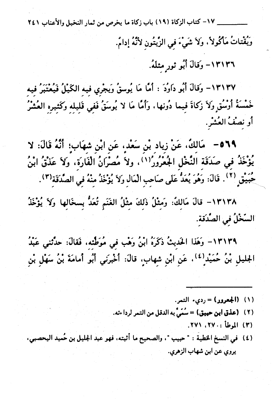 569 - مَالِكٌ، عَنْ زِيَادِ بْنِ سَعْدٍ، عَنِ ابْنِ شِهَابٍ ; أَنَّهُ قَالَ: لَا يُؤْخَذُ فِي صَدَقَةِ النَّخْلِ الْجُعْرُورُ وَلَا مُصْرَانُ الْفَارَةِ وَلَا عَذْقُ ابْنِ حُبَيْقٍ. قَالَ: وَهُوَ يُعَدُّ عَلَى صَاحِبِ الْمَالِ وَلَا يُؤْخَذُ مِنْهُ فِي الصَّدَقَةِ.
