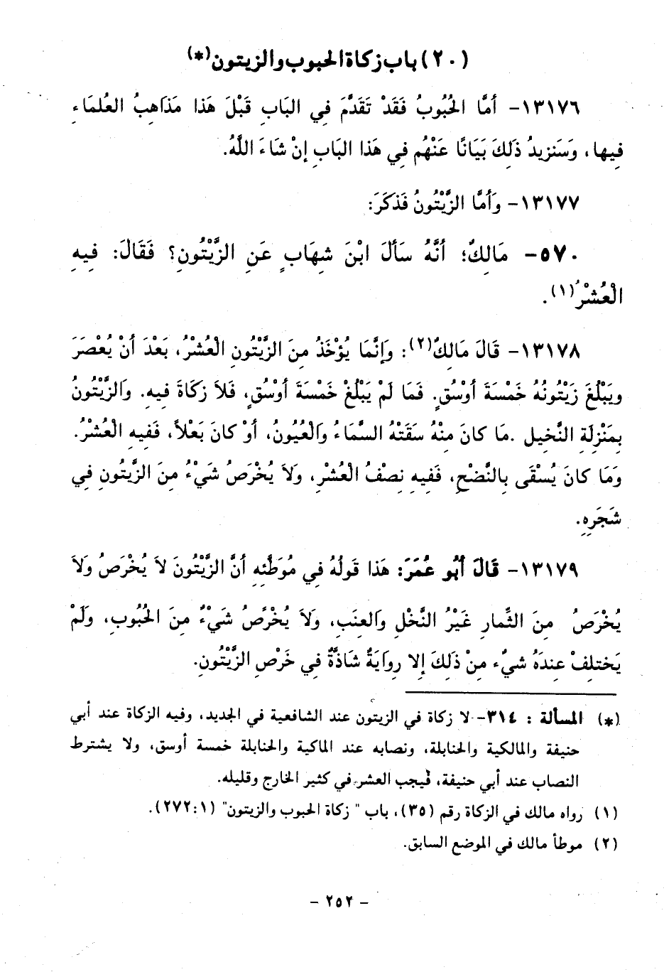 13178 - قَالَ مَالِكٌ: وَإِنَّمَا يُؤْخَذُ مِنَ الزَّيْتُونِ الْعُشْرُ، بَعْدَ أَنْ يُعْصَرَ وَيَبْلُغَ زَيْتُونُهُ خَمْسَةَ أَوْسُقٍ. فَمَا لَمْ يَبْلُغْ خَمْسَةَ أَوْسُقٍ، فَلَا زَكَاةَ فِيهِ. وَالزَّيْتُونُ بِمَنْزِلَةِ النَّخِيلِ. مَا كَانَ مِنْهُ سَقَتْهُ السَّمَاءُ وَالْعُيُونُ، أَوْ كَانَ بَعْلًا، فَفِيهِ الْعُشْرُ. وَمَا كَانَ يُسْقَى بِالنَّضْحِ، فَفِيهِ نِصْفُ الْعُشْرِ، وَلَا يُخْرَصُ شَيْءٌ مِنَ الزَّيْتُونِ فِي شَجَرِهِ.