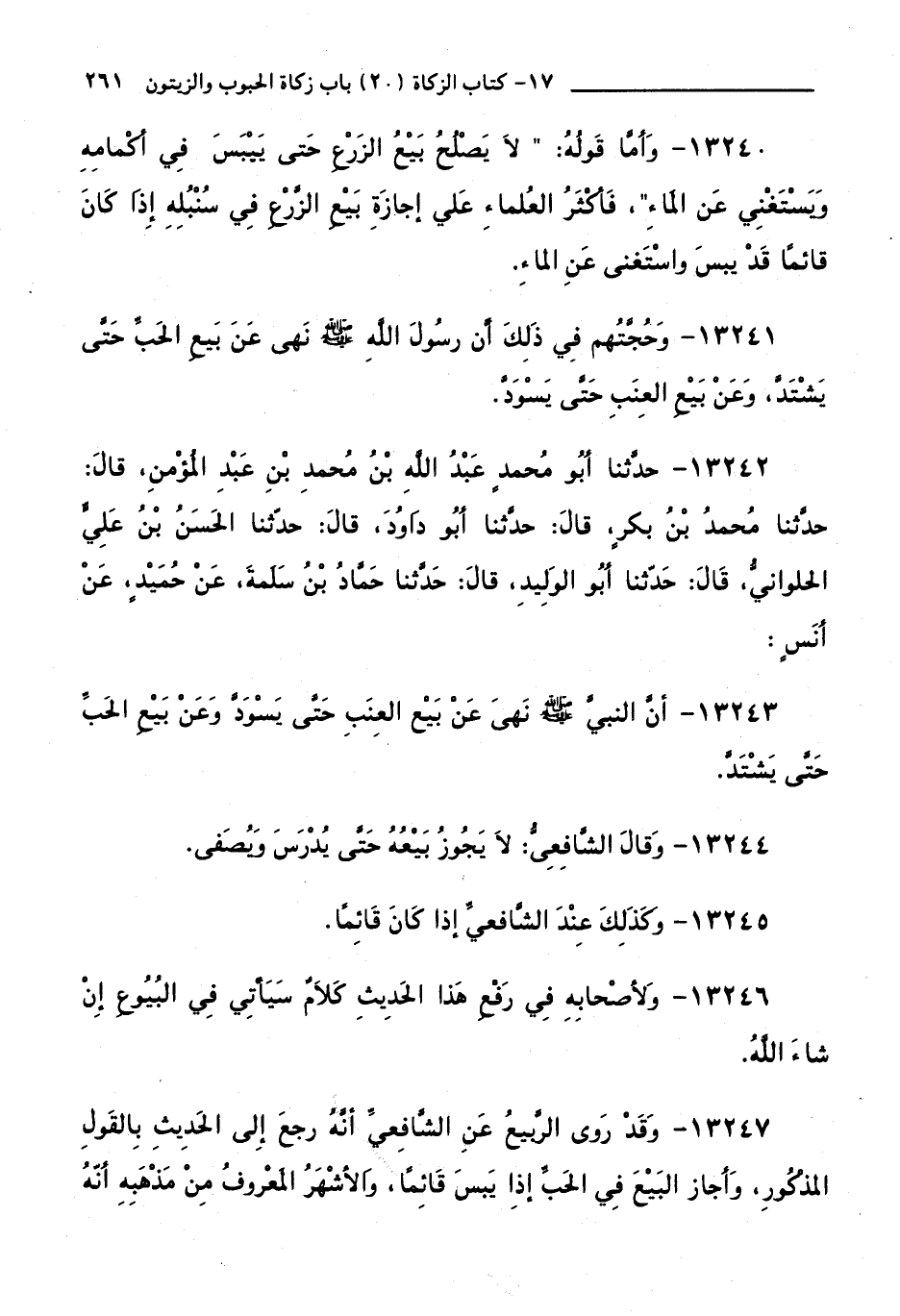 13243 - أَنَّ النَّبِيَّ صَلَّى اللَّهُ عَلَيْهِ وَسَلَّمَ نَهَى عَنْ بَيْعِ الْعِنَبِ حَتَّى يَسْوَدَّ وَعَنْ بَيْعِ الْحَبِّ حَتَّى يَشْتَدَّ.