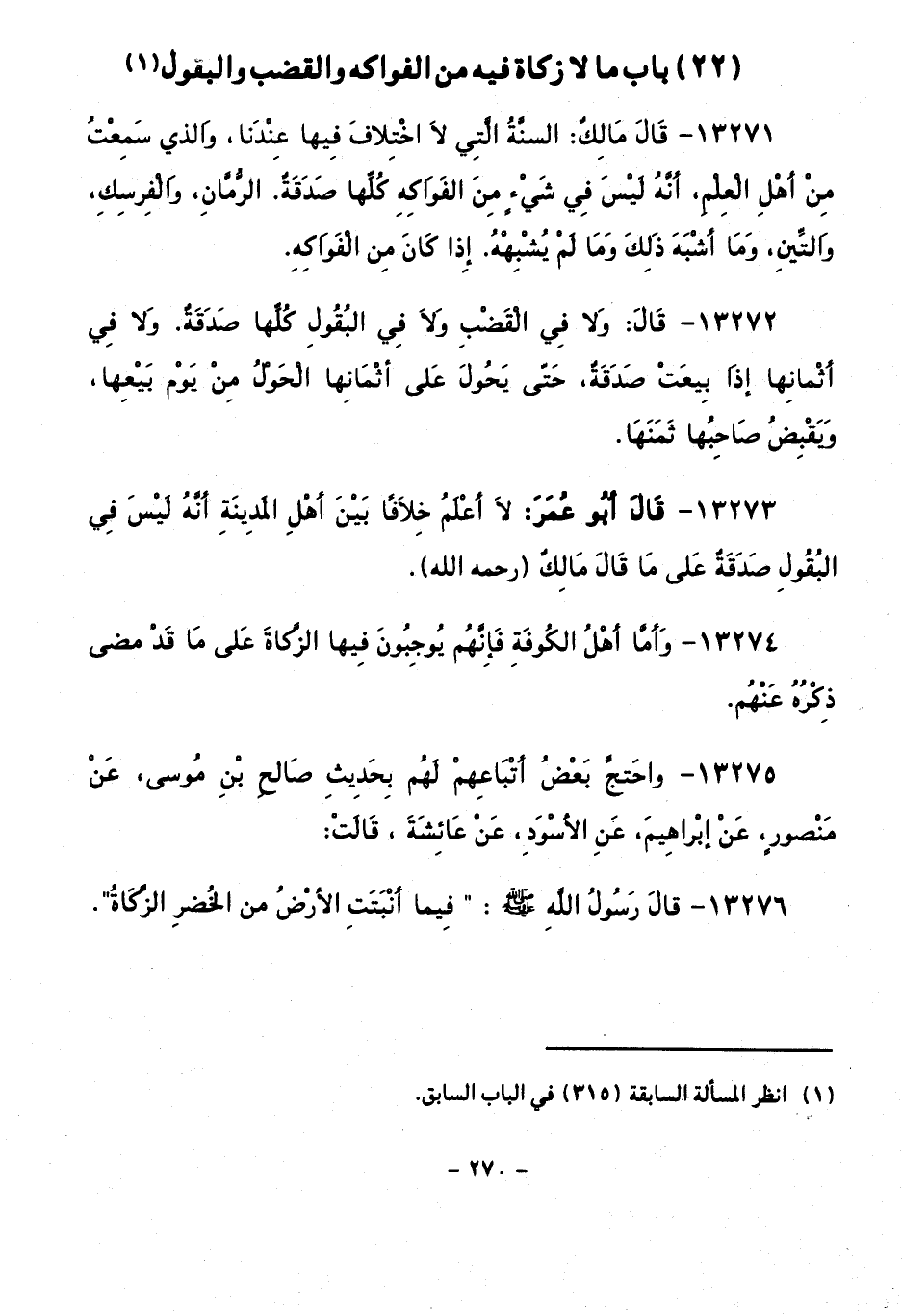 13271 - قَالَ مَالِكٌ: السُّنَّةُ الَّتِي لَا اخْتِلَافَ فِيهَا عِنْدَنَا، وَالَّذِي سَمِعْتُ مِنْ أَهْلِ الْعِلْمِ، أَنَّهُ لَيْسَ فِي شَيْءٍ مِنَ الْفَوَاكِهِ كُلِّهَا صَدَقَةٌ الرُّمَّانِ وَالْفِرْسِكِ وَالتِّينِ وَمَا أَشْبَهَ ذَلَكَ وَمَا لَمْ يُشْبِهْهُ إِذَا كَانَ مِنَ الْفَوَاكِهِ.