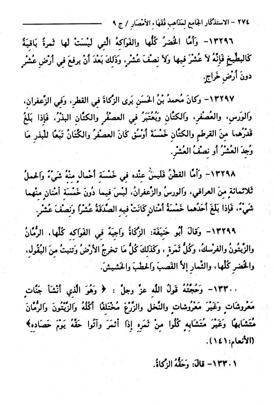 13300 - وَحُجَّتُهُ قَوْلُ اللَّهِ عَزَّ وَجَلَّ:وَهُوَ الَّذِي أَنْشَأَ جَنَّاتٍ مَعْرُوشَاتٍ وَغَيْرَ مَعْرُوشَاتٍ وَالنَّخْلَ وَالزَّرْعَ مُخْتَلِفًا أُكُلُهُ وَالزَّيْتُونَ وَالرُّمَّانَ مُتَشَابِهًا وَغَيْرَ مُتَشَابِهٍ كُلُوا مِنْ ثَمَرِهِ إِذَا أَثْمَرَ وَآتُوا حَقَّهُ يَوْمَ حَصَادِهِ، ( الْأَنْعَامِ: 141 ).