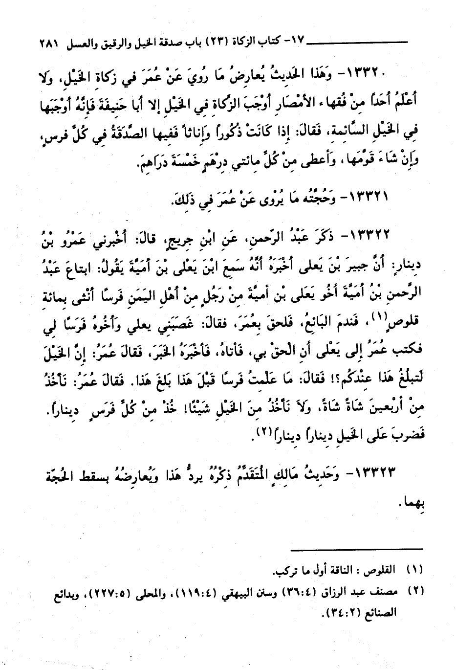 13322 - ذكر عبد الرحمن عن ابن جريج قال أخبرني عمرو بن دينار أن جبير بن يعلى أخبره أنه سمع ابن يعلى بن أمية يقول: ابتاع عبد الرحمن بن أمية أخو يعلى بن أمية من رجل من أهل اليمن فرساً أنثى بمائة قلوص، فندم البائع فلحق بعمر فقال غصبني يعلى وأخوه فرساً لي، فكتب عمر إلى يعلى أن الحق بي، فأتاه فأخبره الخبر، فقال عمر: إن الخيل لتبلغ هذا عندكم، فقال: ما علمت فرسا قبل هذا بلغ هذا. فقال عمر، نأخذ من أربعين شاة شاة ولا نأخذ من الخيل شيئاً، خذ من كل فرس ديناراً. فضرب على الخيل ديناراً ديناراً.