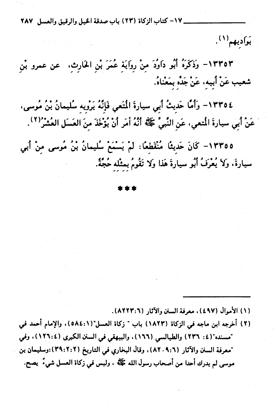 13354 - وَأَمَّا حَدِيثُ أَبِي سَيَّارَةَ الْمُتْعِيِّ فَإِنَّهُ يَرْوِيهِ سُلَيْمَانُ بْنُ مُوسَى، عَنْ أَبِي سَيَّارَةَ الْمُتْعِيِّ، عَنِ النَّبِيِّ صَلَّى اللَّهُ عَلَيْهِ وَسَلَّمَ أَنَّهُ أَمَرَ أَنْ يُؤْخَذَ مِنَ الْعَسَلِ الْعُشْرُ.