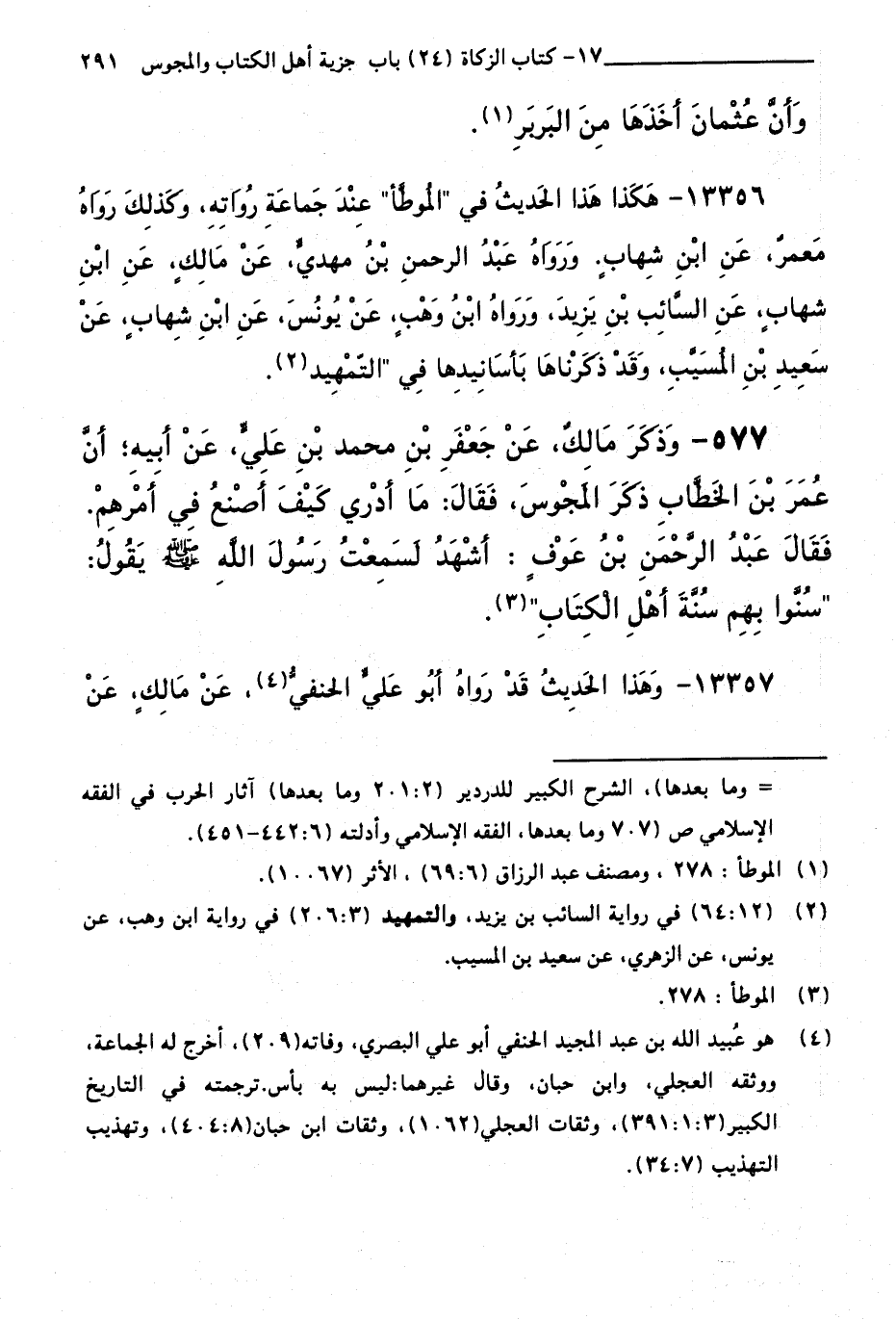 577 - وَذَكَرَ مَالِكٌ، عَنْ جَعْفَرِ بْنِ مُحَمَّدِ بْنِ عَلِيٍّ، عَنْ أَبِيهِ ; أَنَّ عُمَرَ بْنَ الْخَطَّابِ ذَكَرَ الْمَجُوسَ، فَقَالَ: مَا أَدْرِي كَيْفَ أَصْنَعُ فِي أَمْرِهِمْ. فَقَالَ عَبْدُ الرَّحْمَنِ بْنُ عَوْفٍ: أَشْهَدُ لَسَمِعْتُ رَسُولَ اللَّهِ صَلَّى اللَّهُ عَلَيْهِ وَسَلَّمَ يَقُولُ: " سُنُّوا بِهِمْ سُنَّةَ أَهْلِ الْكِتَابِ ".