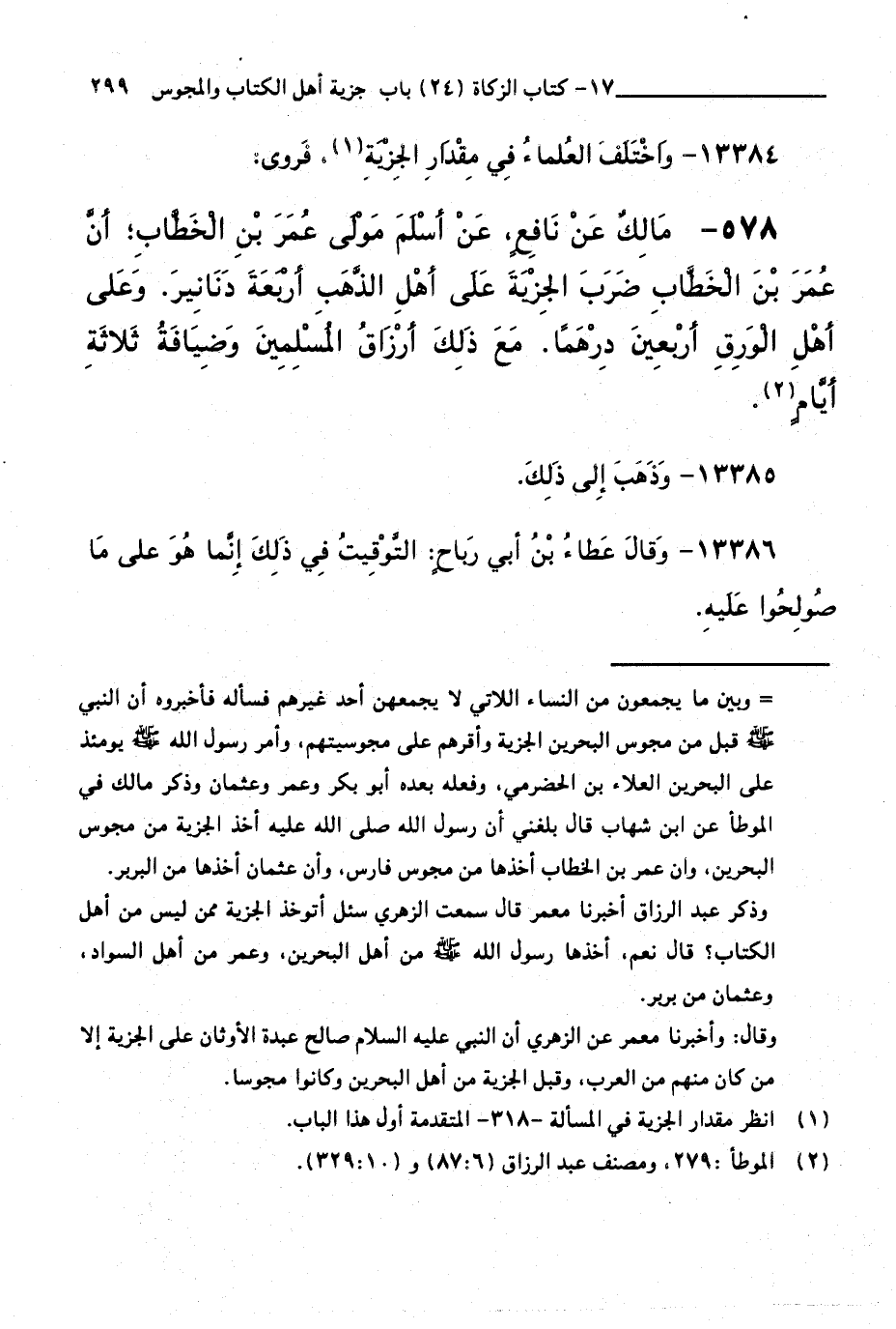 578 - مَالِكٌ عَنْ نَافِعٍ، عَنْ أَسْلَمَ مَوْلَى عُمَرَ بْنِ الْخَطَّابِ أَنَّ عُمَرَ بْنَ الْخَطَّابِ ضَرَبَ الْجِزْيَةَ عَلَى أَهْلِ الذَّهَبِ أَرْبَعَةَ دَنَانِيرَ، وَعَلَى أَهْلِ الْوَرِقِ أَرْبَعِينَ دِرْهَمًا، مَعَ ذَلِكَ أَرْزَاقُ الْمُسْلِمِينَ وَضِيَافَةُ ثَلَاثَةِ أَيَّامٍ.