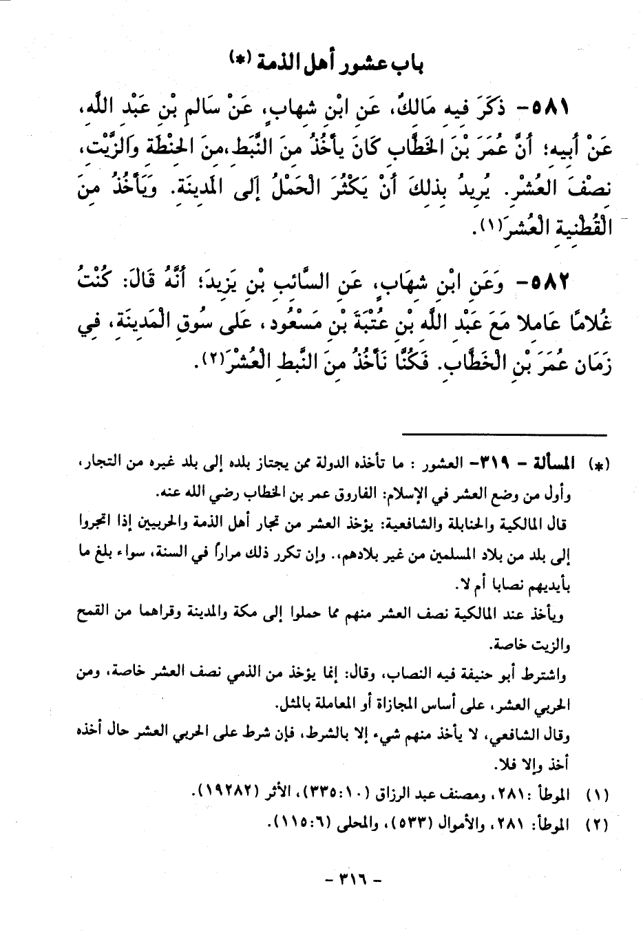 581 - ذَكَرَ فِيهِ مَالِكٌ، عَنِ ابْنِ شِهَابٍ، عَنْ سَالِمِ بْنِ عَبْدِ اللَّهِ، عَنْ أَبِيهِ ; أَنَّ عُمَرَ بْنَ الْخَطَّابِ كَانَ يَأْخُذُ مِنَ النَّبَطِ، مِنَ الْحِنْطَةِ وَالزَّيْتِ، نِصْفَ الْعُشْرِ. يُرِيدُ بِذَلِكَ أَنْ يَكْثُرَ الْحَمْلُ إِلَى الْمَدِينَةِ. وَيَأْخُذُ مِنَ الْقِطْنِيَّةِ الْعُشْرَ.