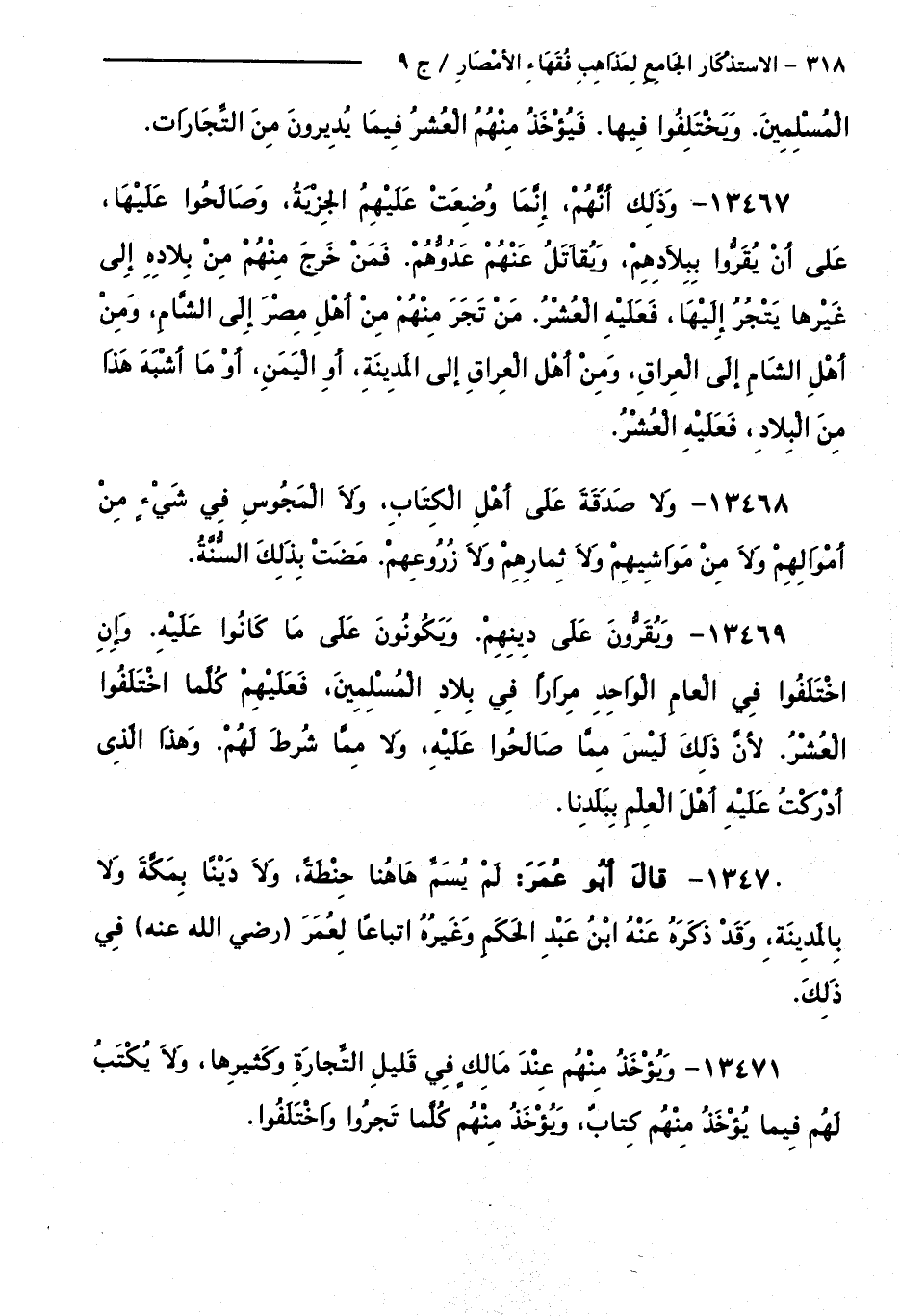 13467 - وَذَلِكَ أَنَّهُمْ، إِنَّمَا وُضِعَتْ عَلَيْهِمُ الْجِزْيَةُ، وَصَالَحُوا عَلَيْهَا، عَلَى أَنْ يَقِرُّوا بِبِلَادِهِمْ، وَيُقَاتَلَ عَنْهُمْ عَدُوُّهُمْ. فَمَنْ خَرَجَ مِنْهُمْ مَنْ بِلَادِهِ إِلَى غَيْرِهَا يَتَّجِرُ إِلَيْهَا، فَعَلَيْهِ الْعُشْرُ. مَنْ تَجِرَ مِنْهُمْ مِنْ أَهْلِ مِصْرَ إِلَى الشَّامِ، وَمِنْ أَهْلِ الشَّامِ إِلَى الْعِرَاقِ، وَمِنْ أَهْلِ الْعِرَاقَ إِلَى الْمَدِينَةِ، أَوِ الْيَمَنِ، أَوْ مَا أَشْبَهَ هَذَا مِنَ الْبِلَادِ، فَعَلَيْهِ الْعُشْرُ.